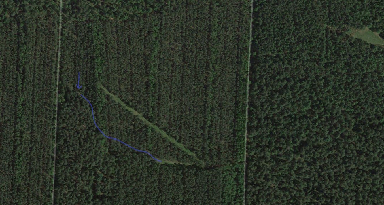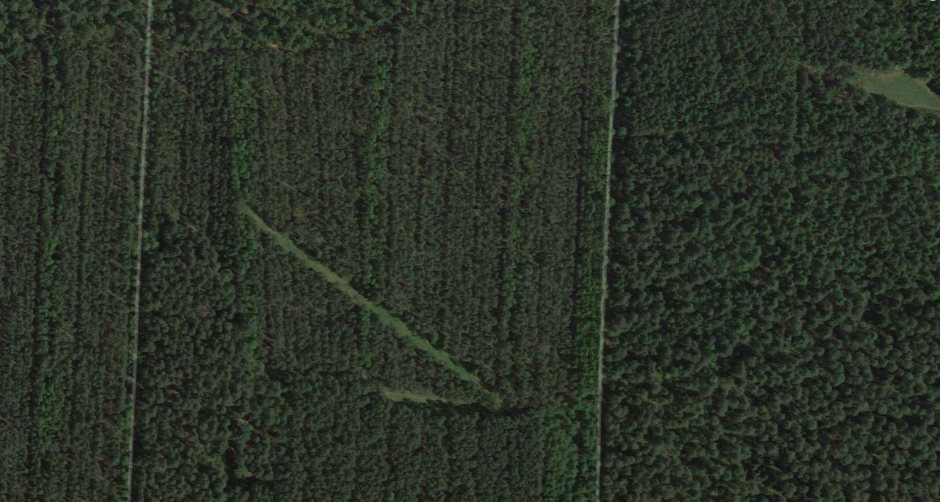 Ne Waldschneise könnte darauf hinweisen. 50m bis 200m breite Freifläche zwischen Waldstücken und dienen dem Brandschutz und der besseren Zugänglichkeit für Forst- und Einsatzfahrzeuge. Im Bild sehe ich auch ne Felsen Links und einen verwaldeten Weg / Zugang zu der Schneise.