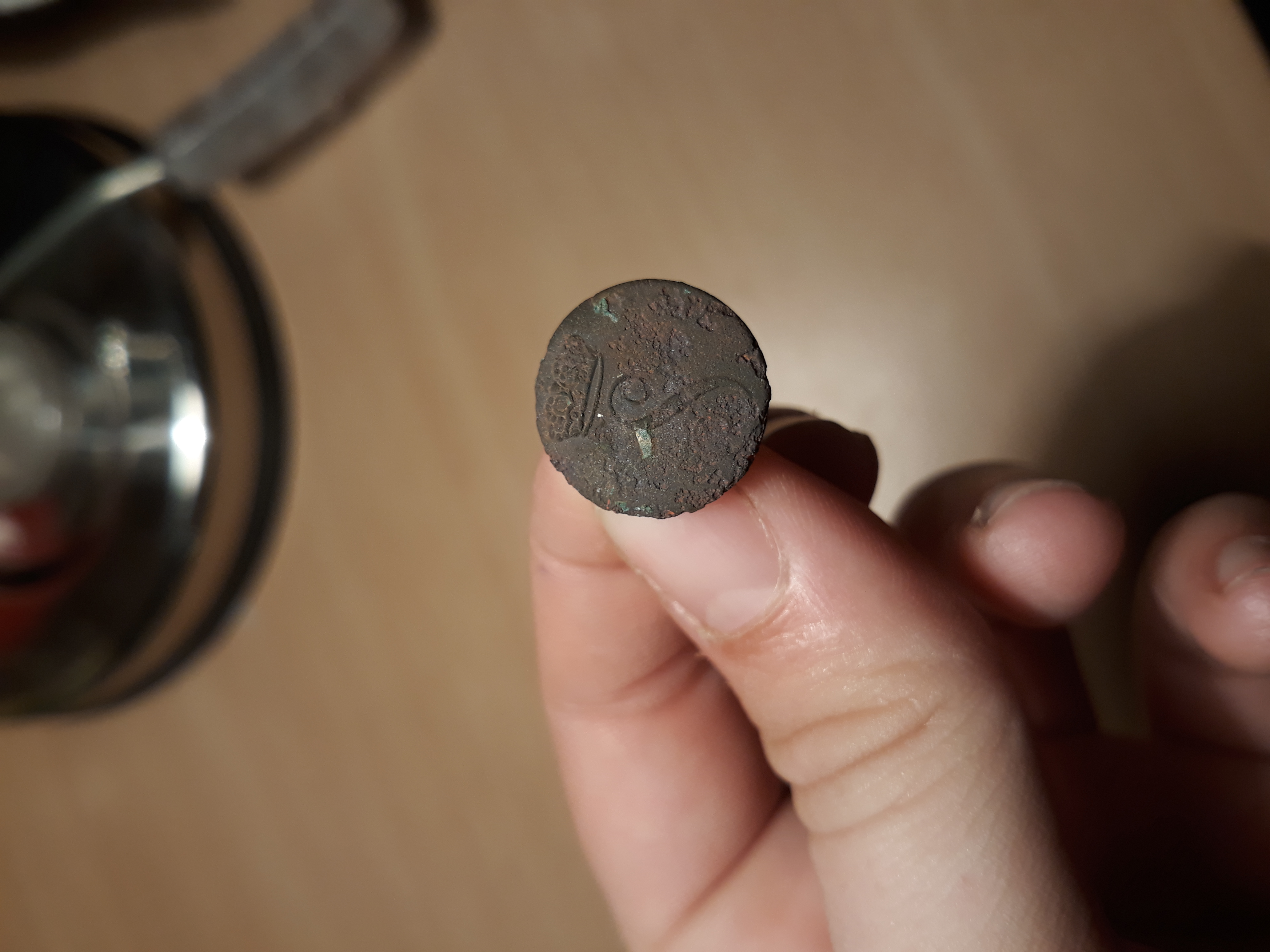 2. Knopf: aus Kupfer, eine Löwe mit Schwert und Zepter, Rückseite kann man zwar einzelne Buchstaben lesen, ergeben aber irgendwie keinen Sinn, eine Krone ist auch drauf hinten. Im Netz findet man nur bayrischer Beamtenknopf dazu, aber nix genaueres