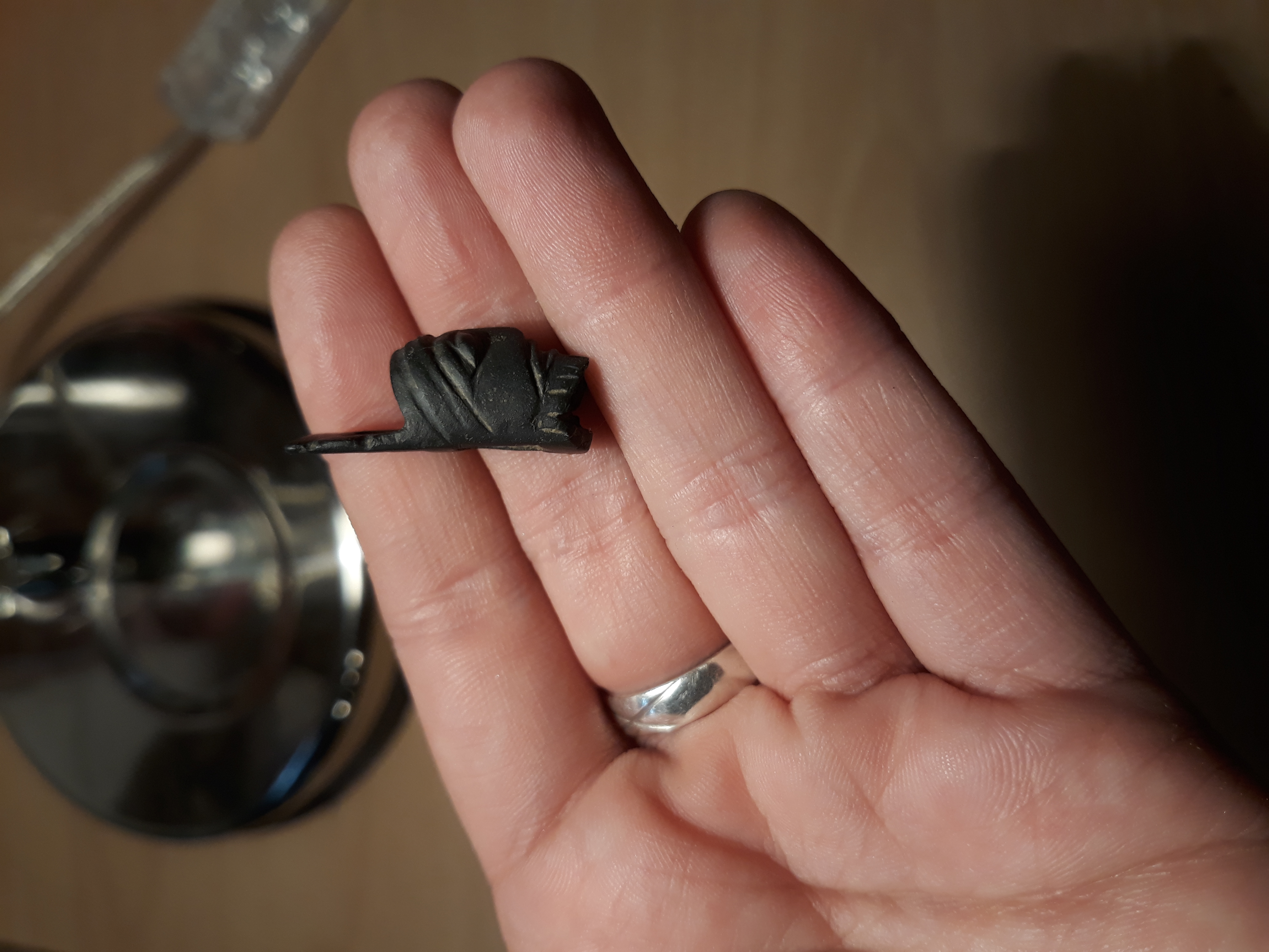 Naja, dafür heute ein kleine interessante Bronzefigur/Kopf gefunden. Sie ist etwa 3 cm lang und 1,5 cm breit, innen hohl und scheint einen Griff oder Aufhängung zu haben. Hat jemand eine Ahnung was das gewesen sein könnte und wie alt das sein könnte?