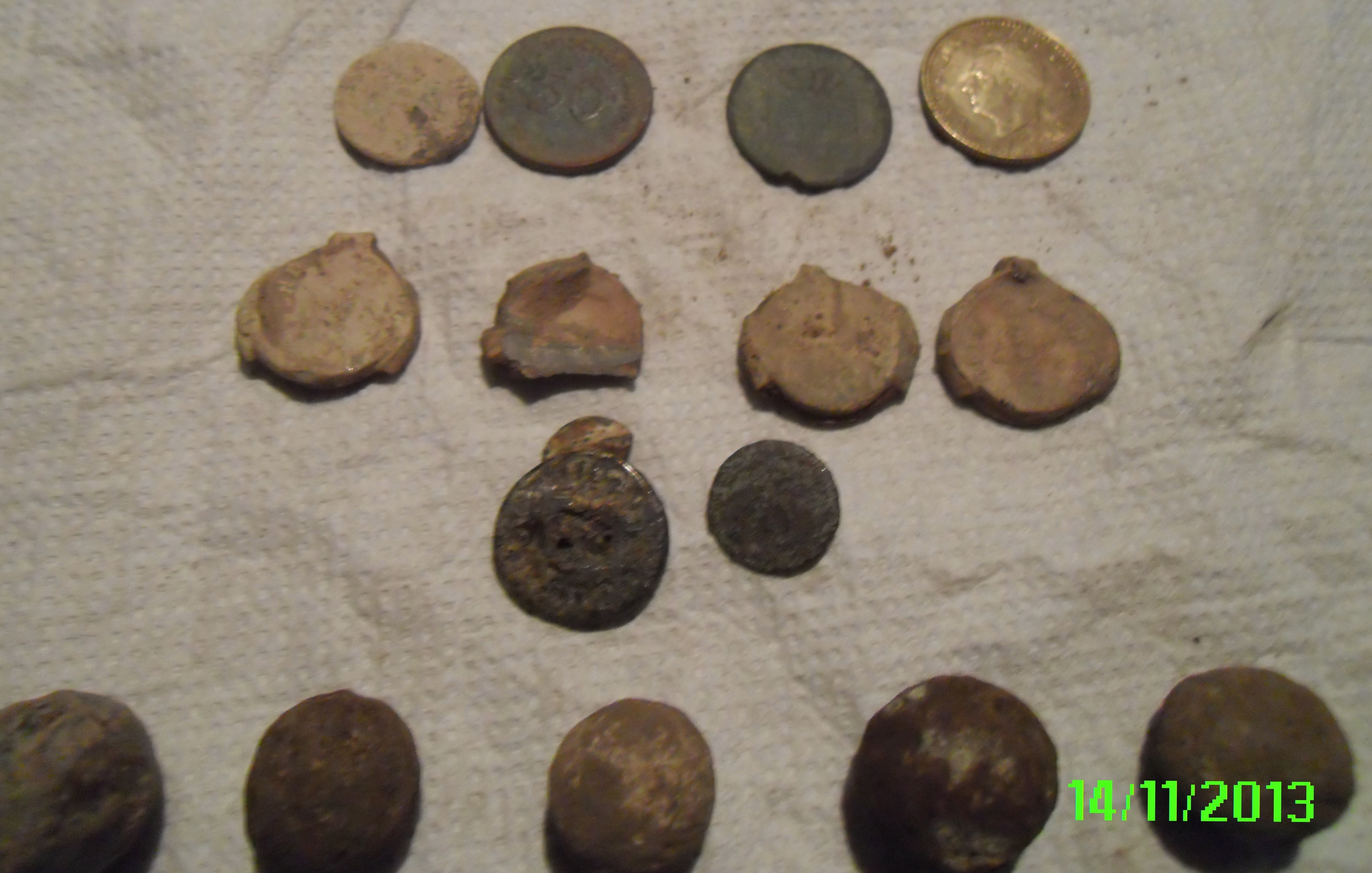 Hu Hu ! Ich dachte gestern bei dem schönen Wetter musste doch mal übern Acker laufen . :mrgreen: Es kamen ein paar Mussketen kugeln, und die üblichen Plomben zum Vorschein ,2 knöpfe eine 2 Pfennig Scheide Münze, 50 Pfennig , 1 Pesetas plus 2 Geschossköpfe und natürlich Schrott :mrgreen: Mfg und gut Fund an Alle Strulle. :winken: :winken: