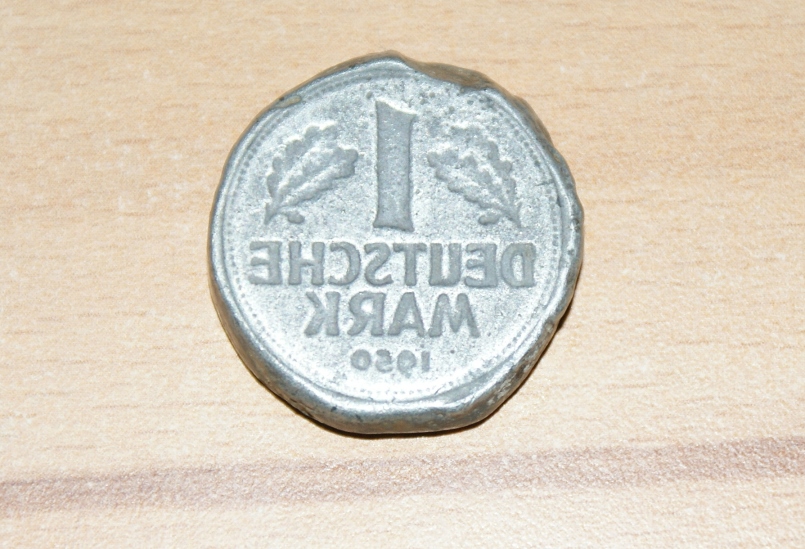 Für mich sieht es so aus, als hätte jemand mit flüssigem Metall ein Markstück übergossen. Ob das Spielerei, es der Versuch war einen Schmuckanhänger zu basteln, oder ob wirklich jemand falsche Münzen kreiren wollte, bleibt wohl im Dunkeln.