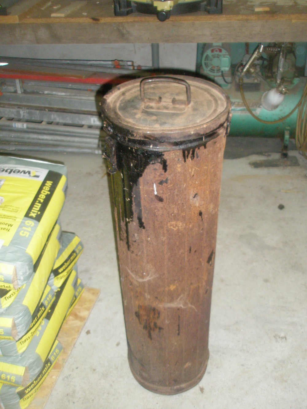 ich bräuchte mal Hilfe bei der Bestimmung dieses Containers.er hat zum teil noch das wehrmachtsgrün,leider war teer darin gelagert,man erkennt keinerlei stempel mehr.innen sind ringsrum längst holzleisten angebracht.er ist nen knappen meter hoch und oben und unten hat er nen griff.