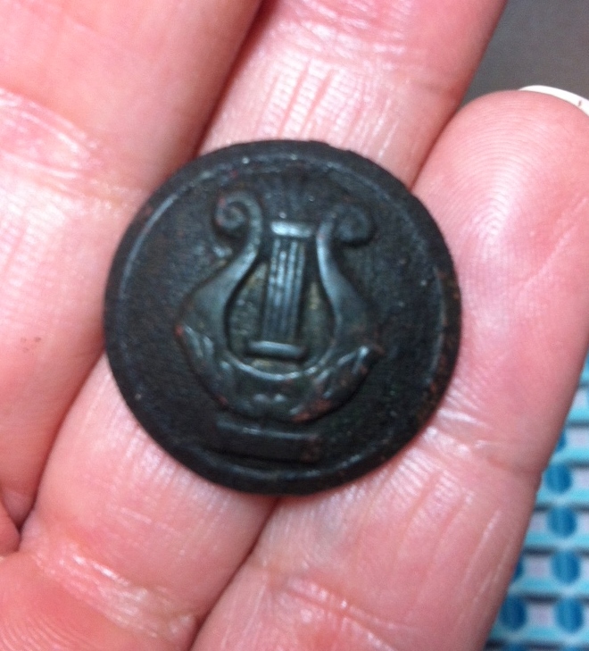 gestern beim sondeln einen schönen Knopf gefunden. Mit einer Harfe bzw. Leier drauf? Kann mir die jemand bestimmen? Hab ihn noch nicht richtig sauber gemacht. Um das Instrument herum scheinen ganz filigrane Querrillen.