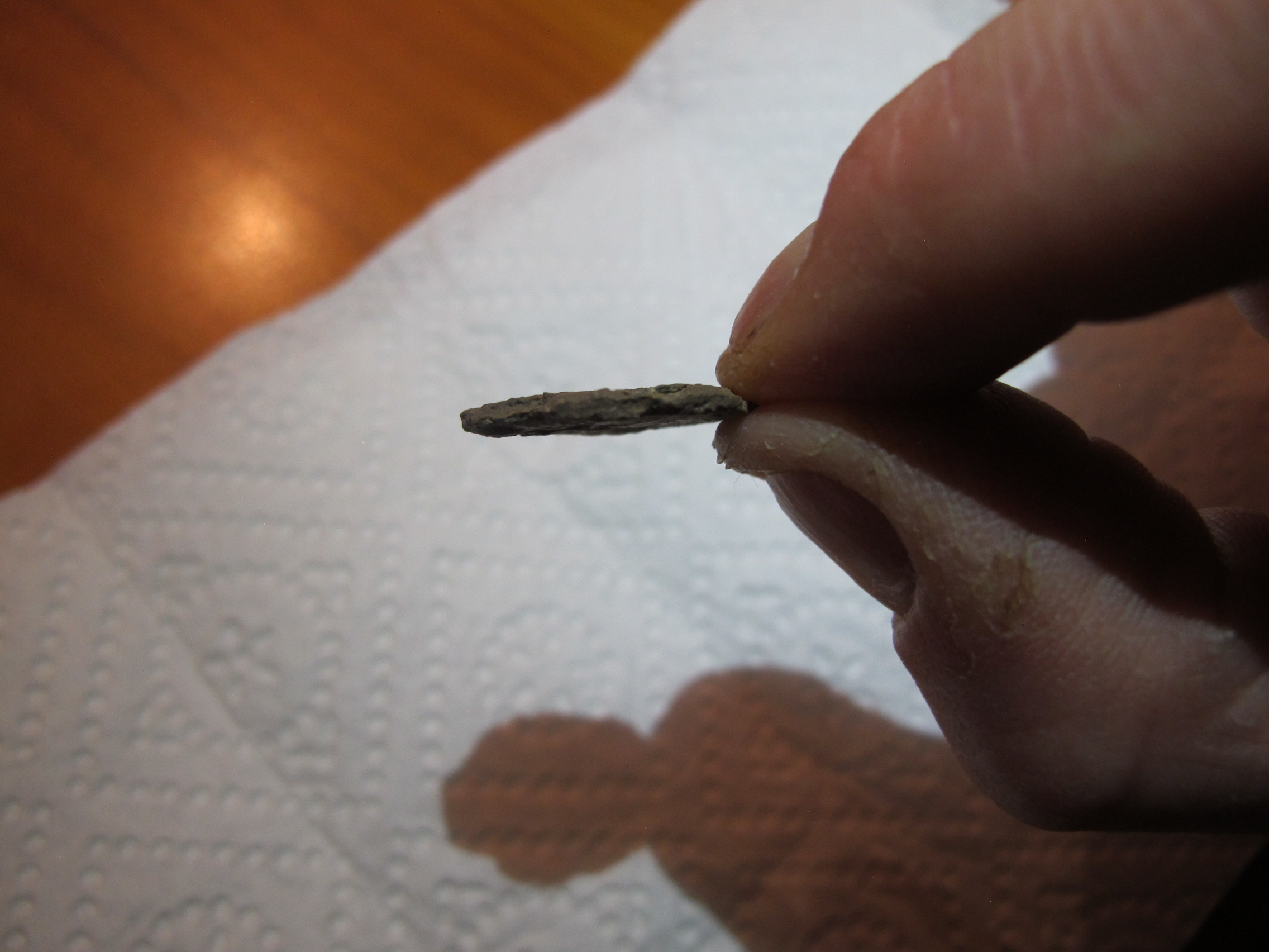 So hier nochmals von der Seite...scheint mir viel zu dünn für eine Plombe...ich bin aber blutiger Anfänger.....das Stück ist auch superleicht..also Blei würde ich als Material mal ausschliessen...