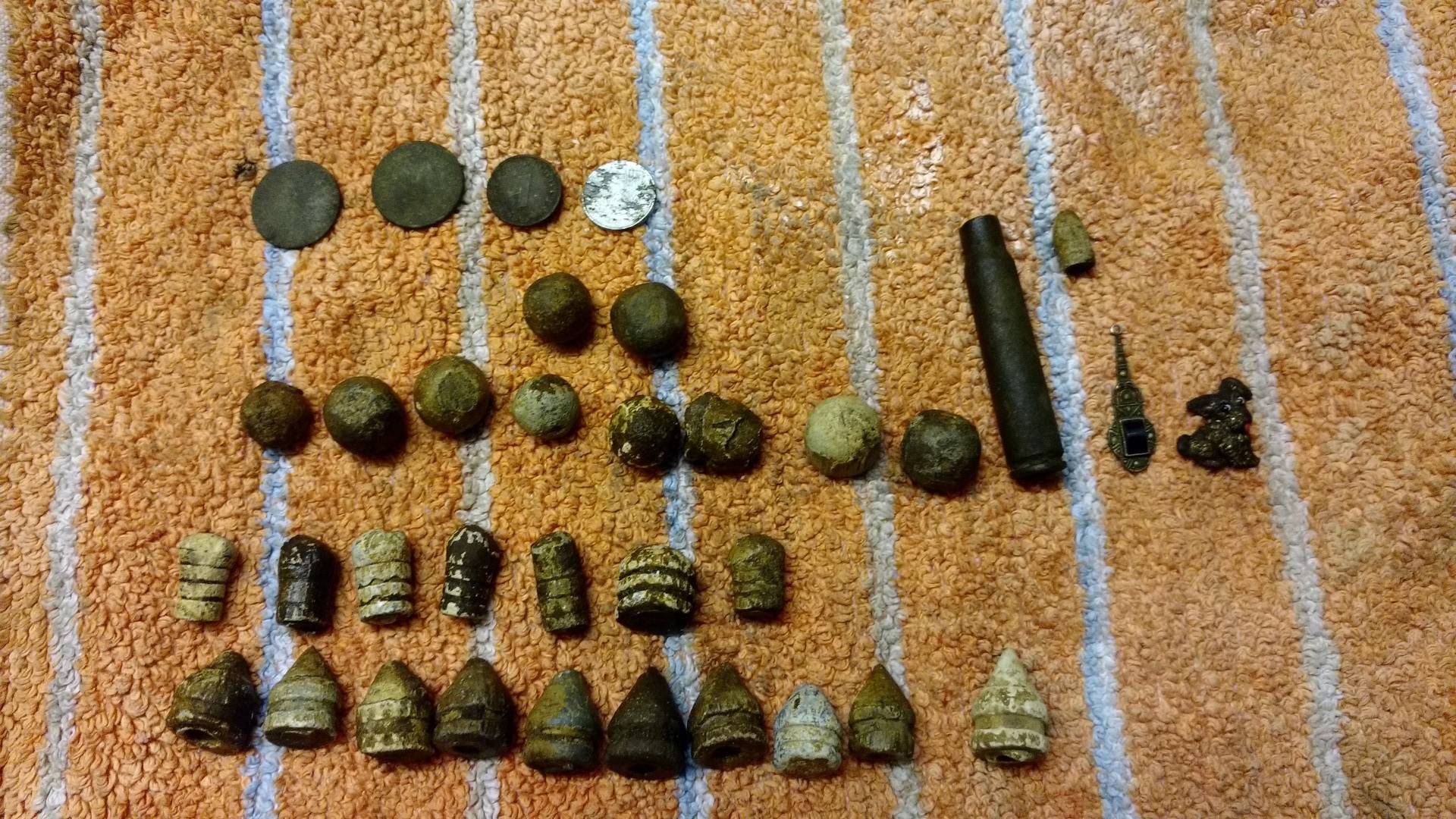 Neben unzähligen Musketenkugeln und anderen Bleigeschossen tauchten zwei 5-Pfennig-Stücke aus dem Kaiserreich, 1-DDR Pfennig und 1 Pfennig aus Adolf's Zeiten auf.
