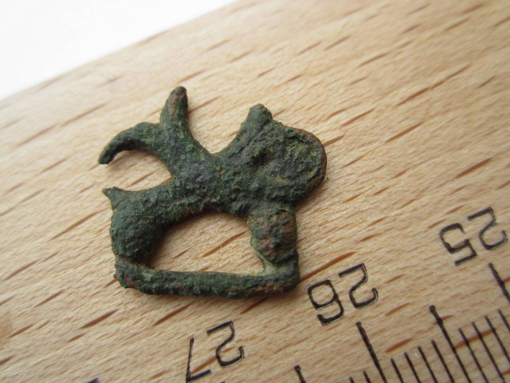 Ich bin ziemlich ratlos, was Form und Funktion dieses Stückes betrifft, eine Befestigungsmöglichkeit ist nämlich nicht zu erkennen. Der untere Teil sieht aus wie eine sehr kleine Schnalle, darüber ist aber etwas tierähnliches zu erkennen, Anklänge an einen Löwen ? Diesem würde aber ein Gebilde wie ein Fischschwanz aus dem Rücken wachsen. also das ist völlig verrückt.