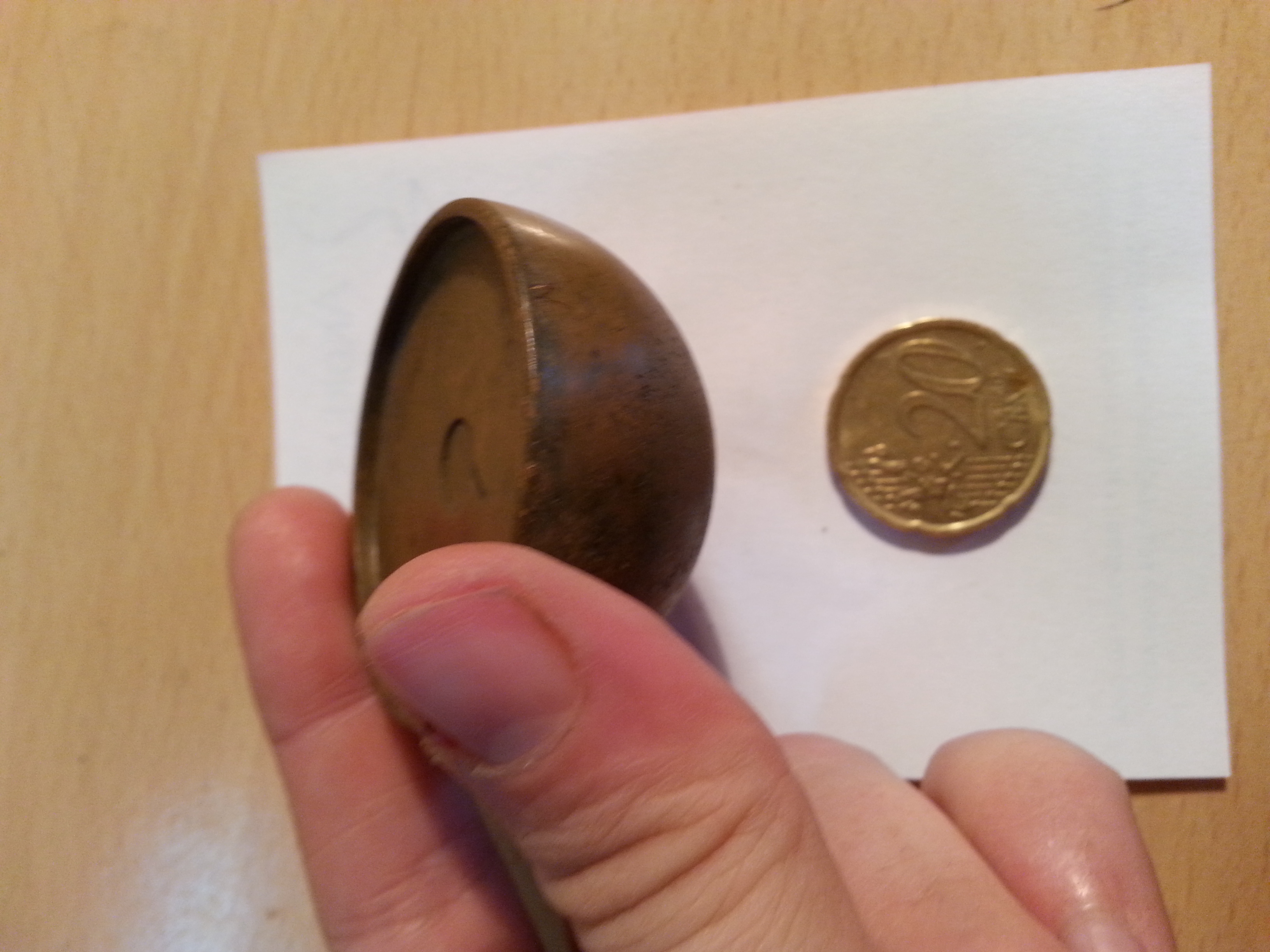 vielleicht kann dazu jemand was sagen. Die Halbkugel ist denke ich aus Messing (oder Kupfer), sie ist voll befüllt und wiegt 166 g. Sie hat keinerlei Inschrift.