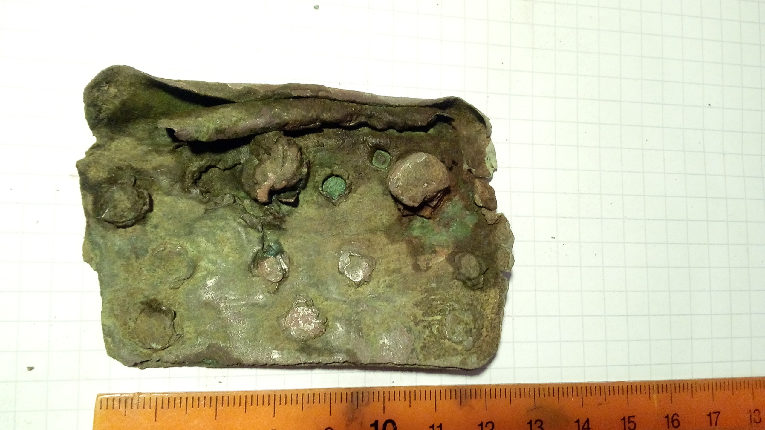 Hi ich fand heute diese Stücke Kupferblech auf einem Weg im Wald, die Nieten müssten ebenfalls aus Kupfer sein.