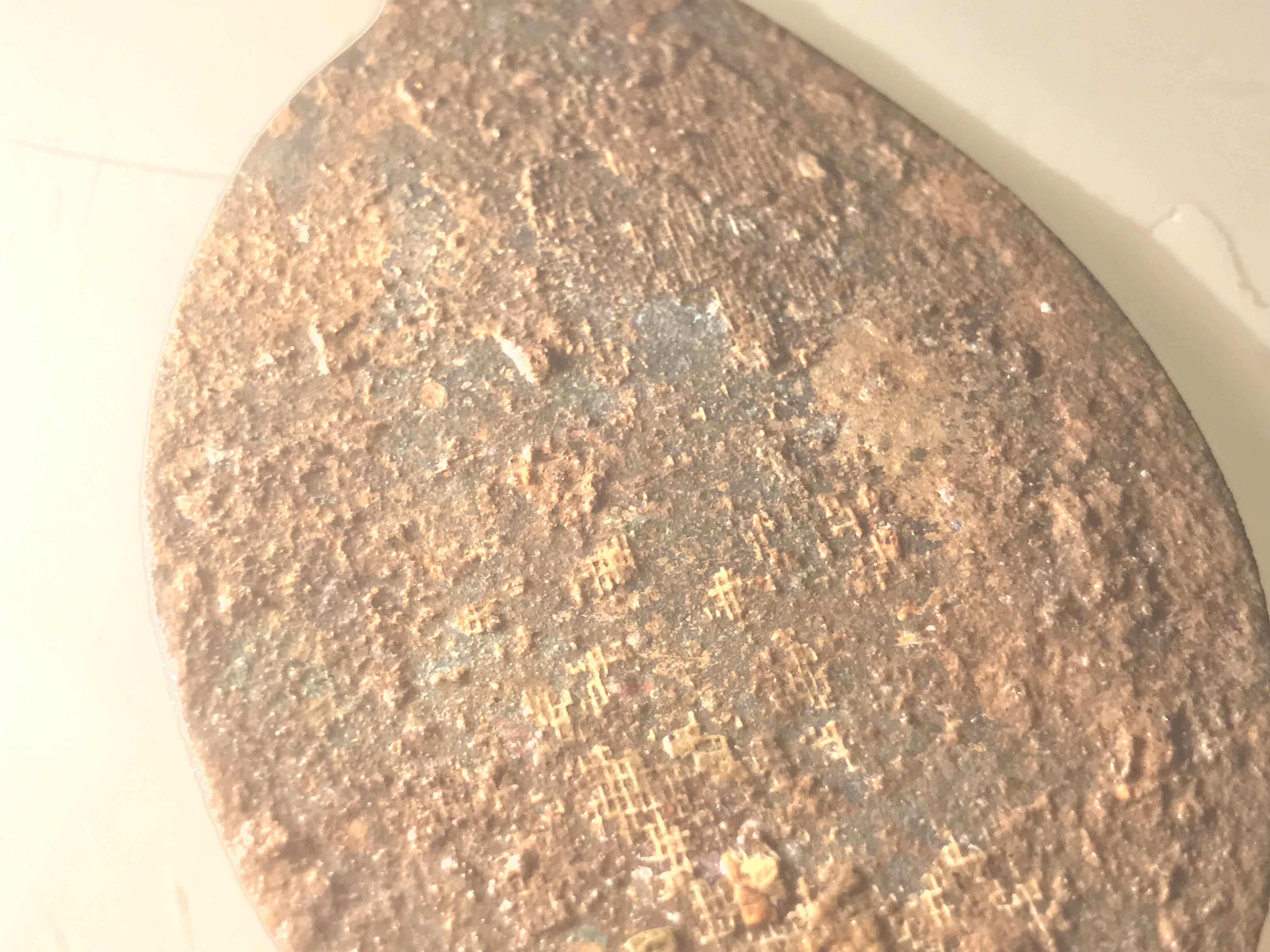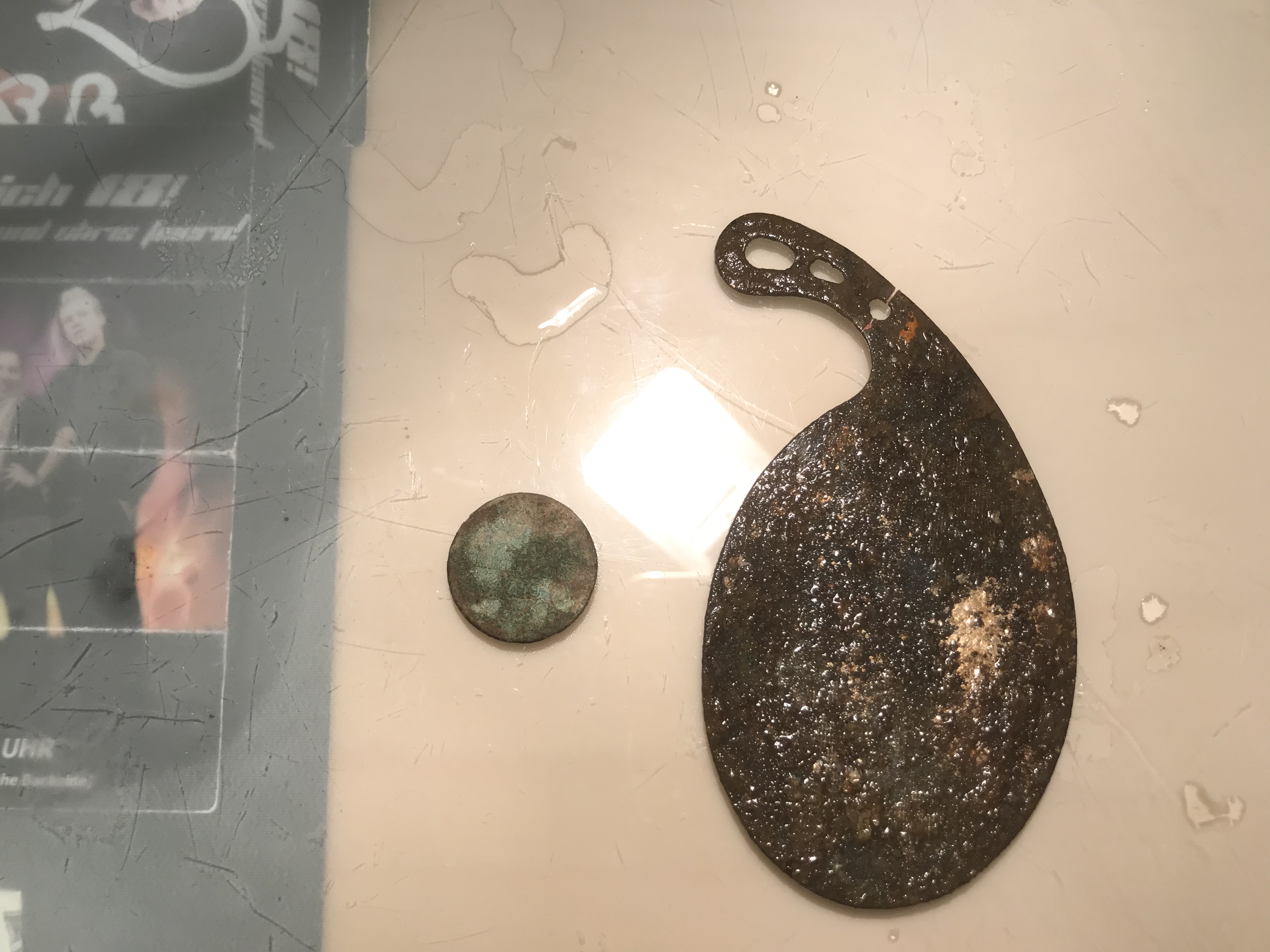 Beim sondeln im Wald haben wir mal wieder etwas seltsames gefunden, in ca 35cm tiefe. Ich komm bei der Form auf nichts was mir einen Hinweis geben könnte was es ist, das Objekt ist aus Kupfer mit einem göldlichen Beschlag. Außerdem hat es eine Textilartige Struktur. Hat jemand einen Rat? Weiterhin haben wir noch 1 Kreutzer von 1759 gefunden