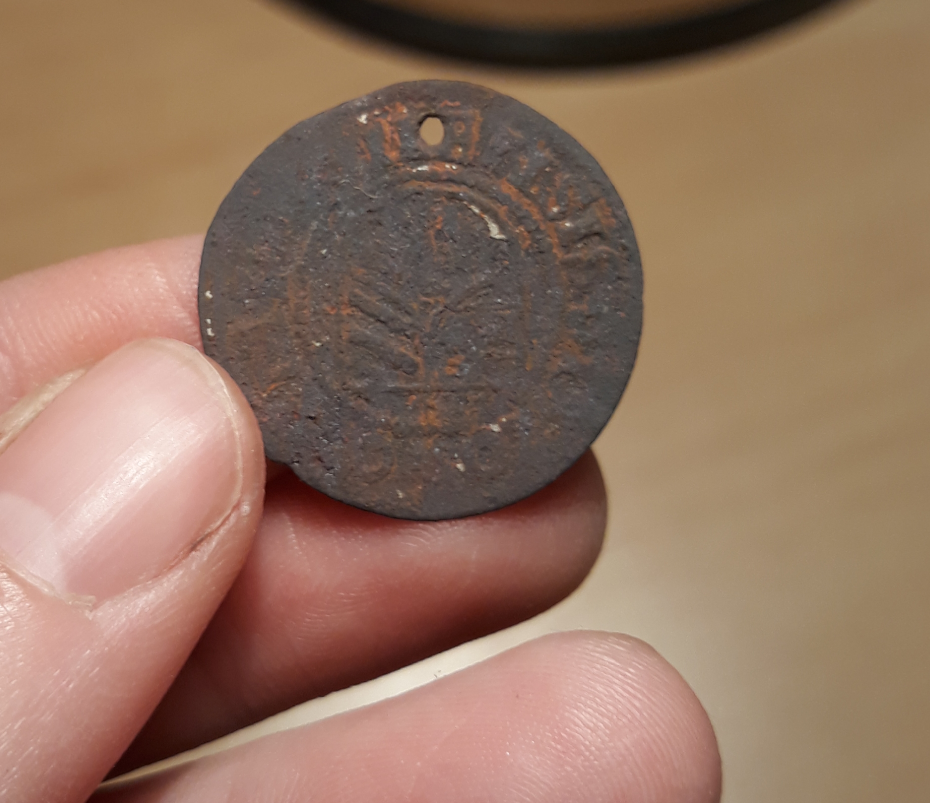 Wieder mal etwas, dass wir nicht zuordnen können. Eine Seite Doppelkopfadler, auf der anderen ein Wappen. Fundgebiet: Niederbayern. Material: Kupfer, scheint vergoldet gewesen zu sein. Entwertet. Durchmesser etwa 2 cm.