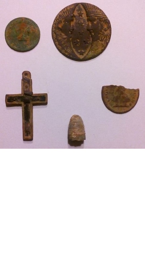 1 Pfennig 1875 sowie ein Geschoss und die Hälfte eines (eher neueren Heiligenanhängers....