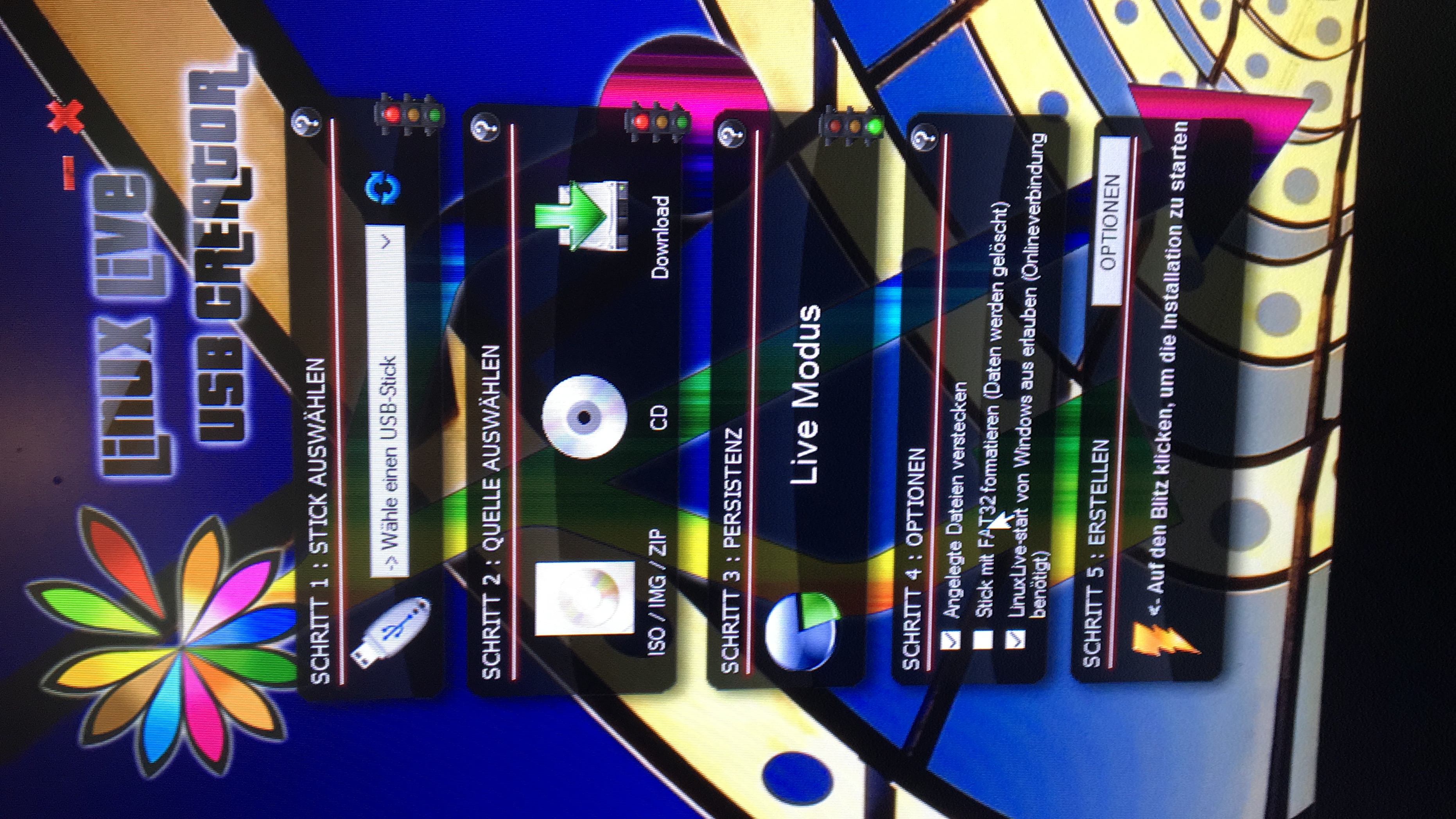 Man verwendet dafür einen USB Stick und die Software LinuxLive USB Creator.