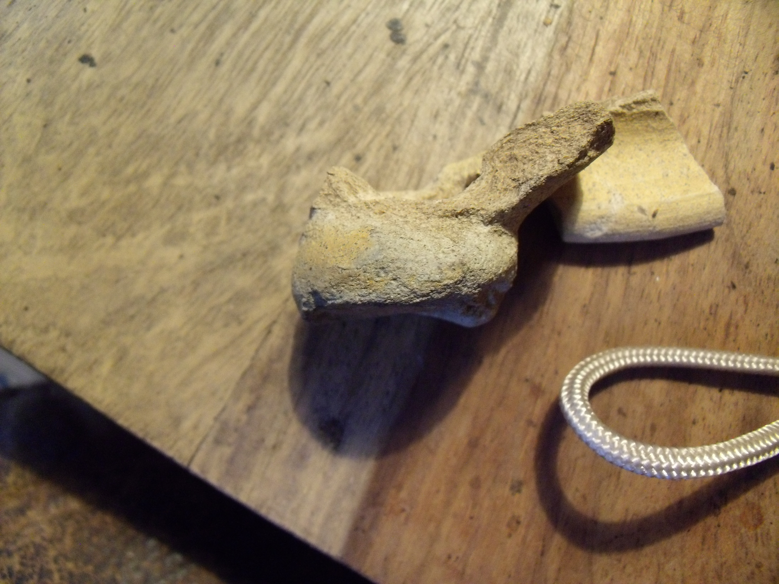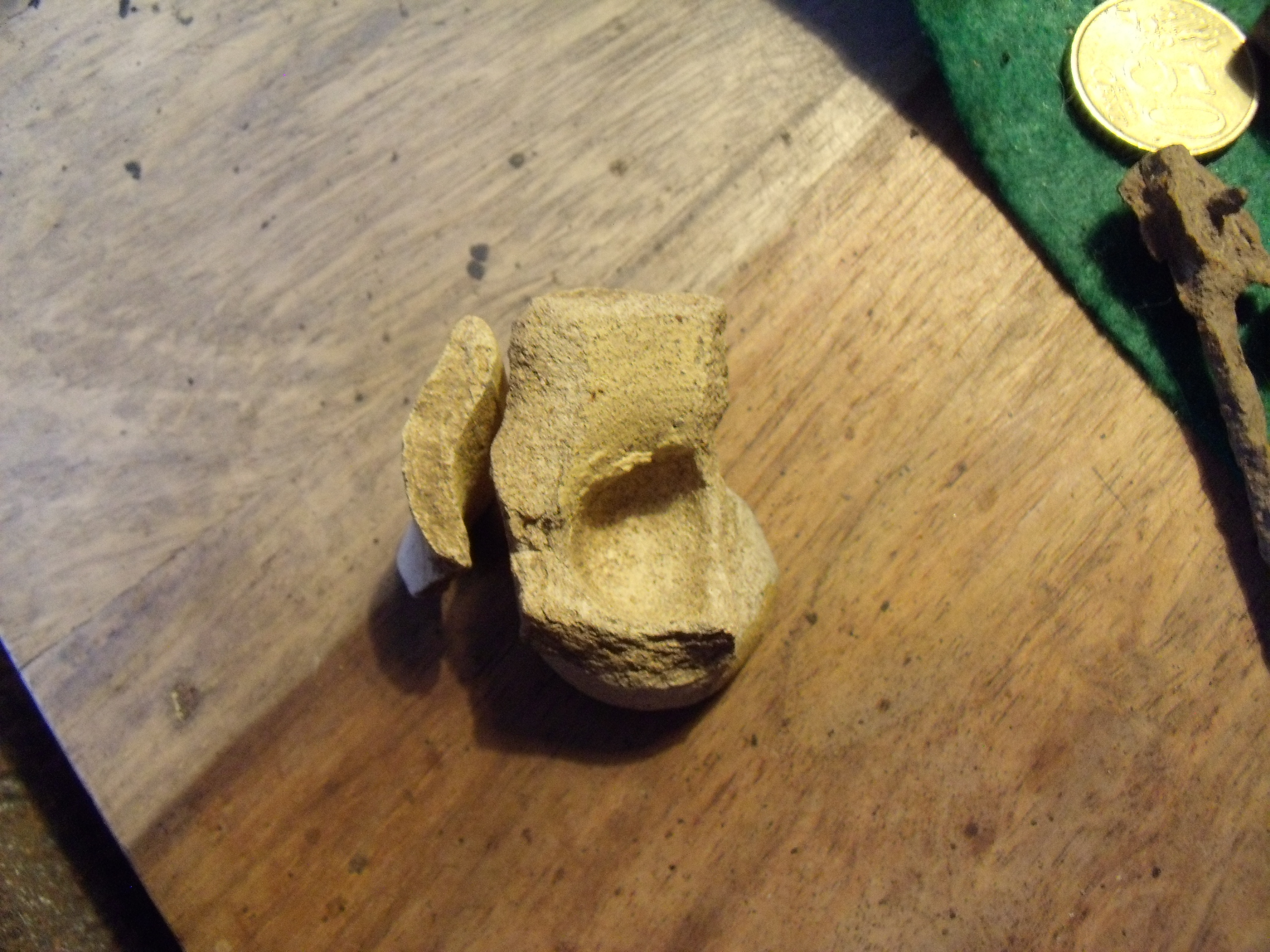 ich habe eine Scherbe mit rundem Füsschen gefunden. Das Füsschen hat eine Führungsrille die nicht durch gebrauch entstanden ist, sie wurde vor dem Brand geformt.
