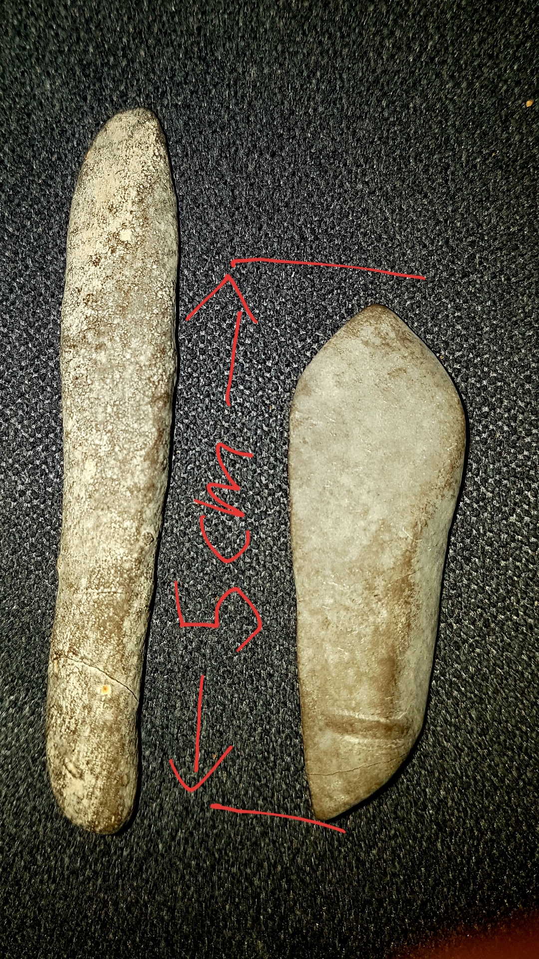 Habe diese 2 Stücke schon länger bei mir rumliegen aber frage mich jetzt doch ob es sich nicht um Steinzeitliches Werkzeug handeln könnte. Das Material ist zwar mutmaßlich Basalt, was ungewöhnlich wäre aber ich finde sie haben doch schon sehr "werkzeugähnliche" Formen. Vor allem das längliche Stück ähnelt sehr einem Schaber oder einem Messer da das vordere Drittel und die Spitze (schwierig auf dem Bild darzustellen) wie bei einer Klinge zuläuft und auch recht scharf ist. Auch das kleinere Objekt läuft vorne scharf zu und lässt auch eine dreiecksform wie zum Beispiel bei einer Pfeilspitze erkennen.