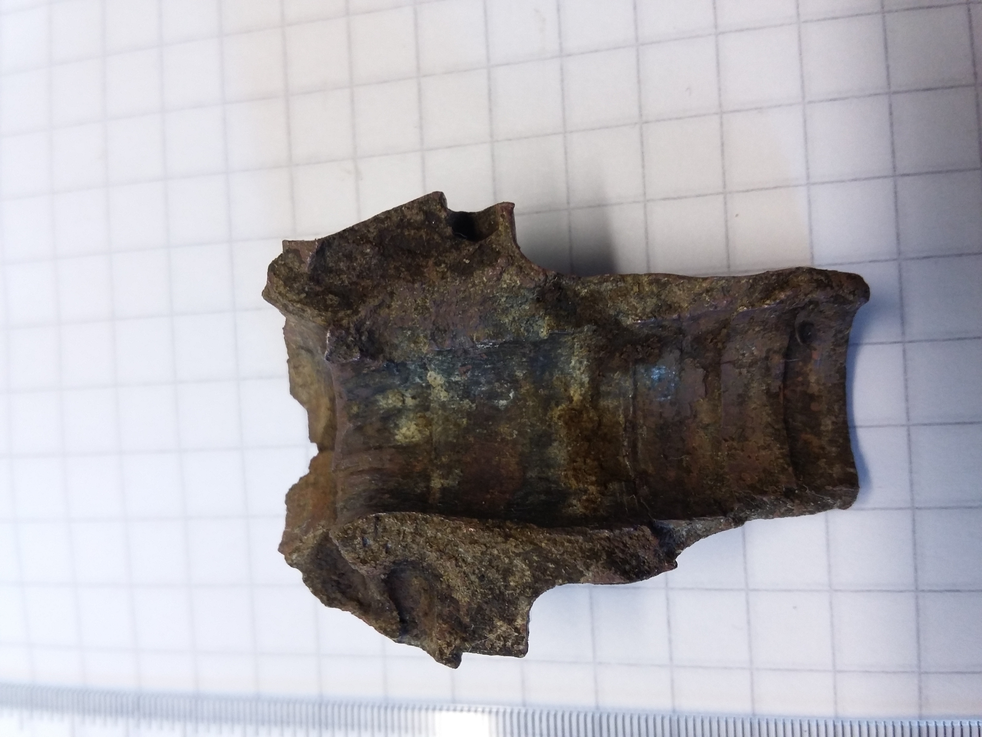 Beschriftungen sind keine zu erkennen. Lediglich an den Bruchstellen des konischen Teils und der darunter liegenden Fuge sind jeweils eine Bohrung zu erkennen.