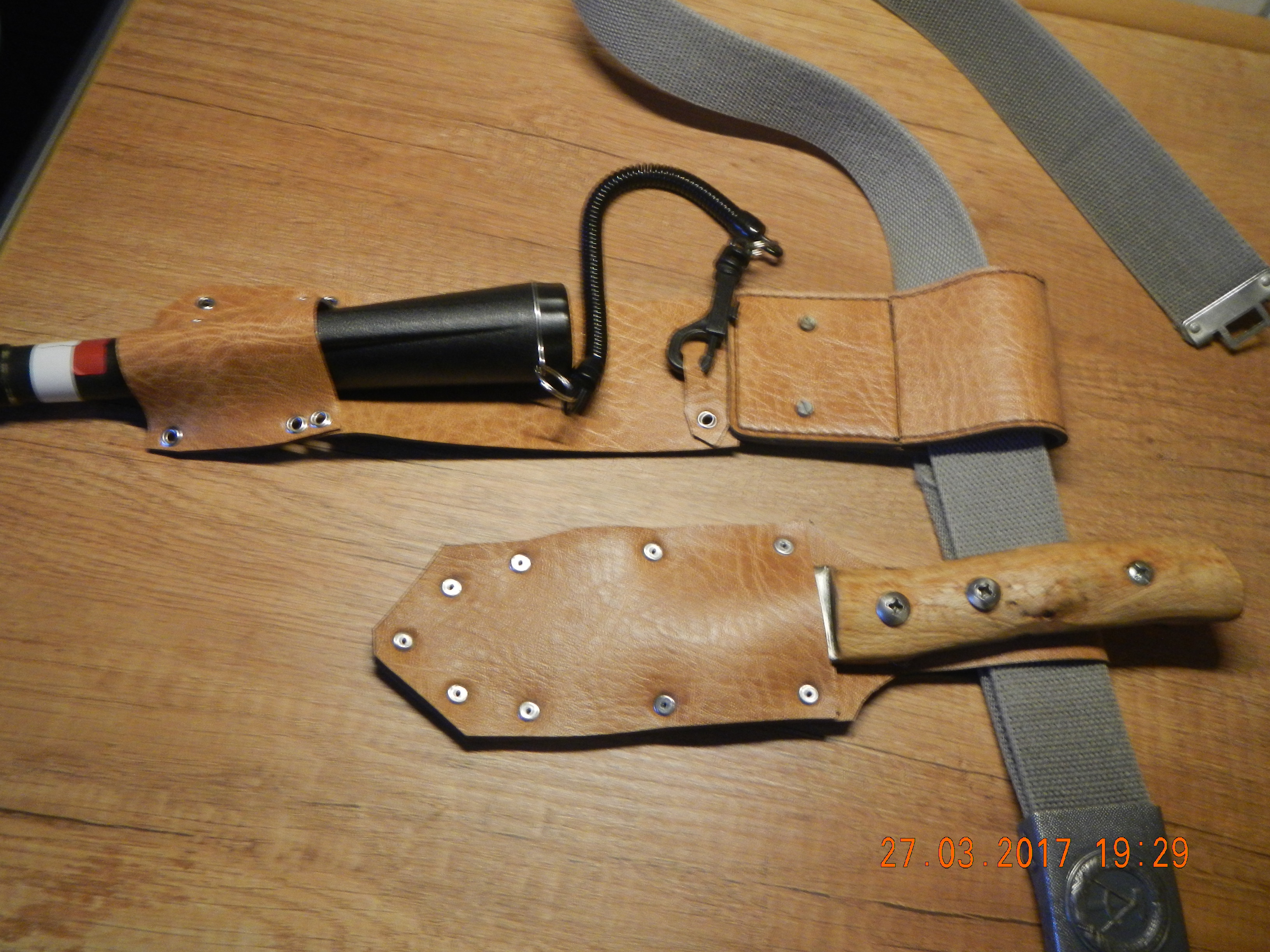 hab auseinem alten lederkoffer ein scheide fürs grabungsmesser und einen köcher für den pp gebastelt(der originale ist zu unhandlig) mal sehen ,ob sich ales bewährt
