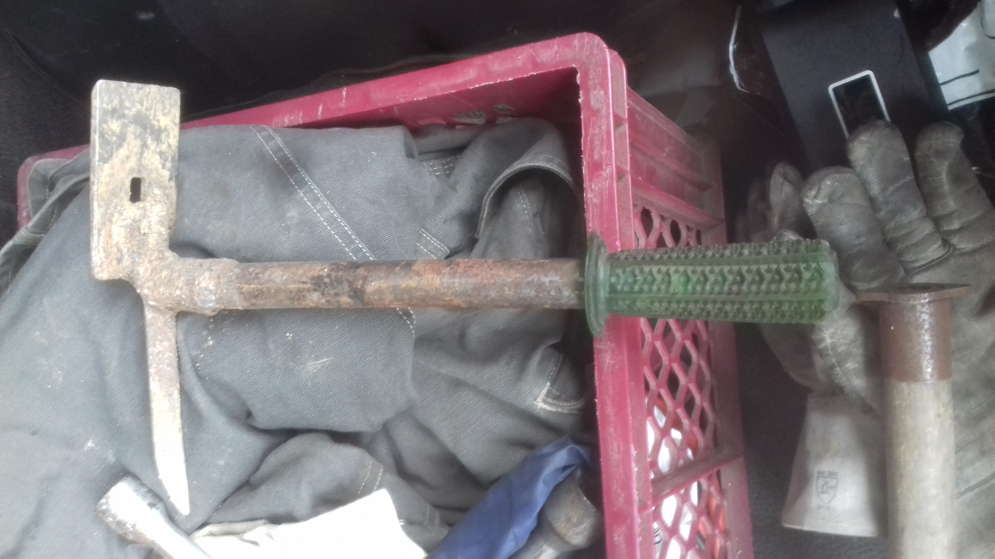 Praxistipp: Im Baumarkt gibt es Werkzeughalter mit denen Dachdecker ihren Dachdeckerhammer am Gürtel befestigen. Diese kann man man hervorragend benutzen um die Grabehacke am Gürtel zu befestigen.