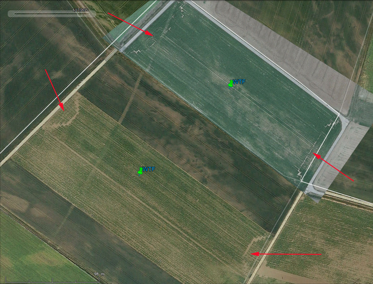 Hallo an alle, bei meiner Google Maps Suche bin ich auf 2 Strukturen in einem Feld gestossen. Diese waren in mehreren Jahren sichtbar aber nie beide zusammen in einem Jahr, deshalb habe ich beide Bilder uebereinander gelegt.