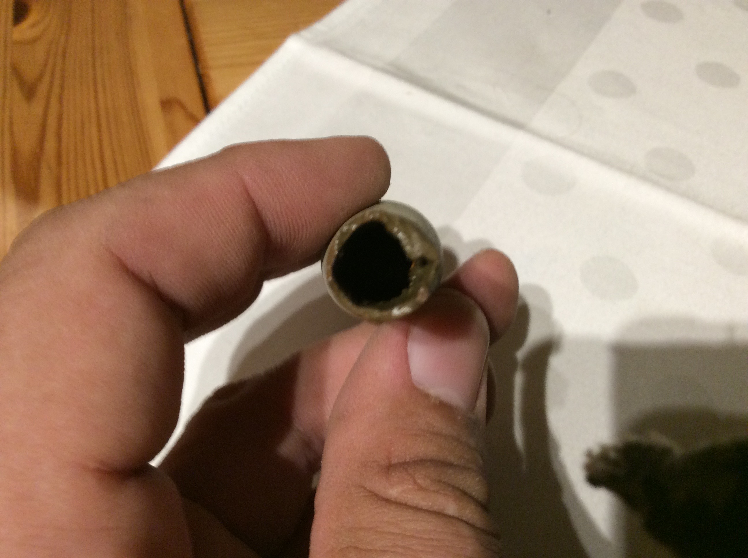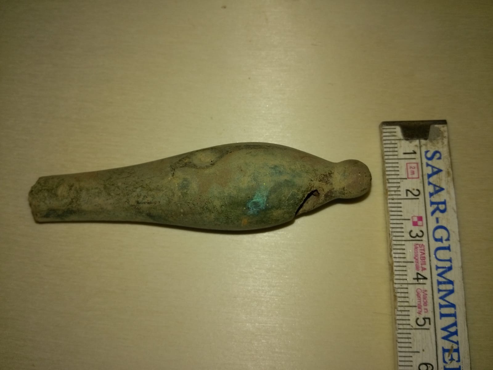 Was sich hierbei allerdings als verstörend erweist, ist das Loch am Pommel.Entweder mit einem Loch und Pommel, oder durchgängig hohl, ohne Pommel.Dieser wurde dann nach dem Aufschieben des Griffklobens, mittels Gewinde am Ende aufgeschraubt.