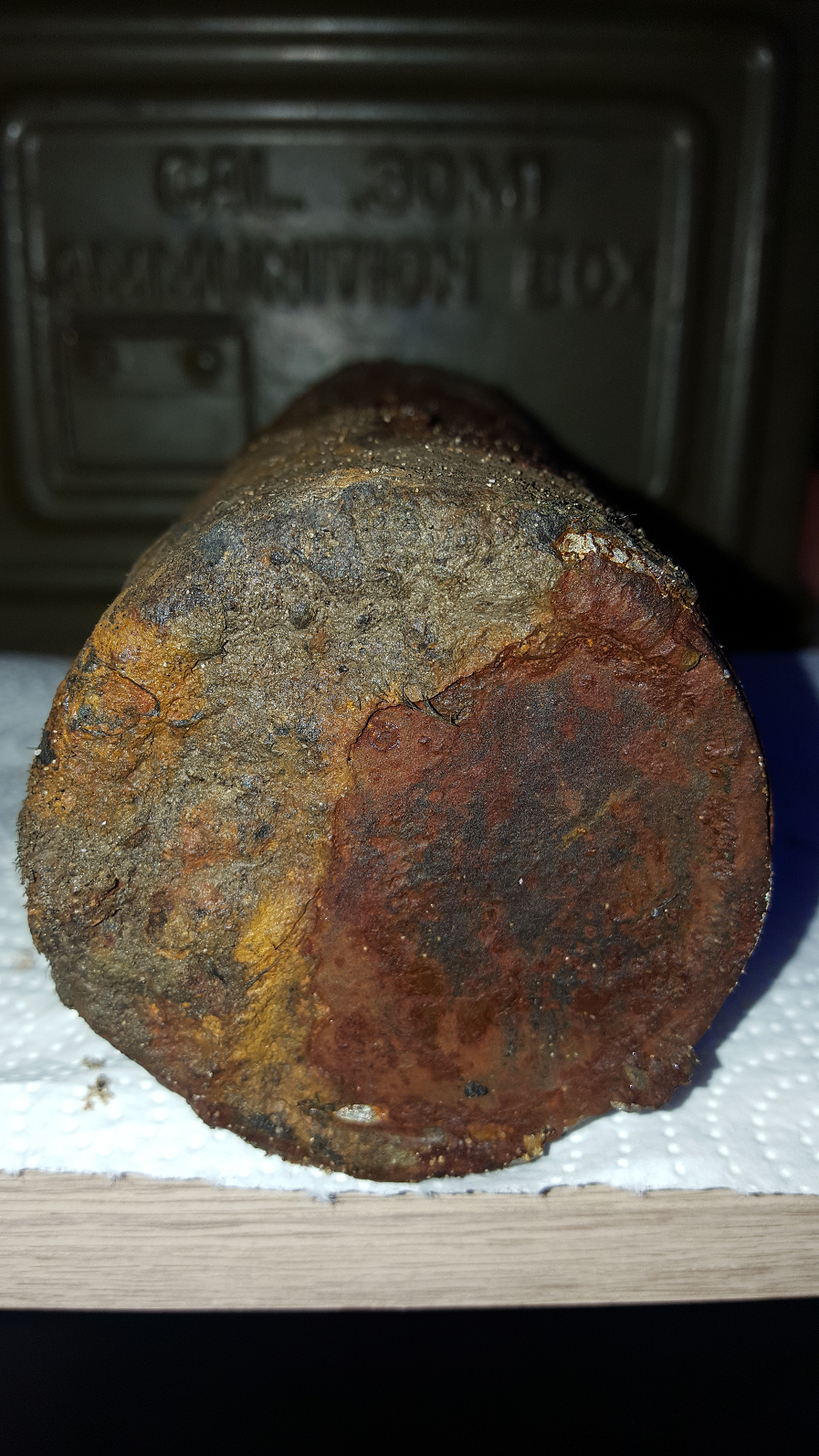 ich war heute mit einem Kollegen in Arnheim am Niederhein magnetfischen. Bei meinem ersten Wurf habe ich das hier geborgen. Ich bin mir nicht ganz sicher, was das sein könnte, aber es sieht so aus wie eine Art Geschoss oder Ladung!?!?