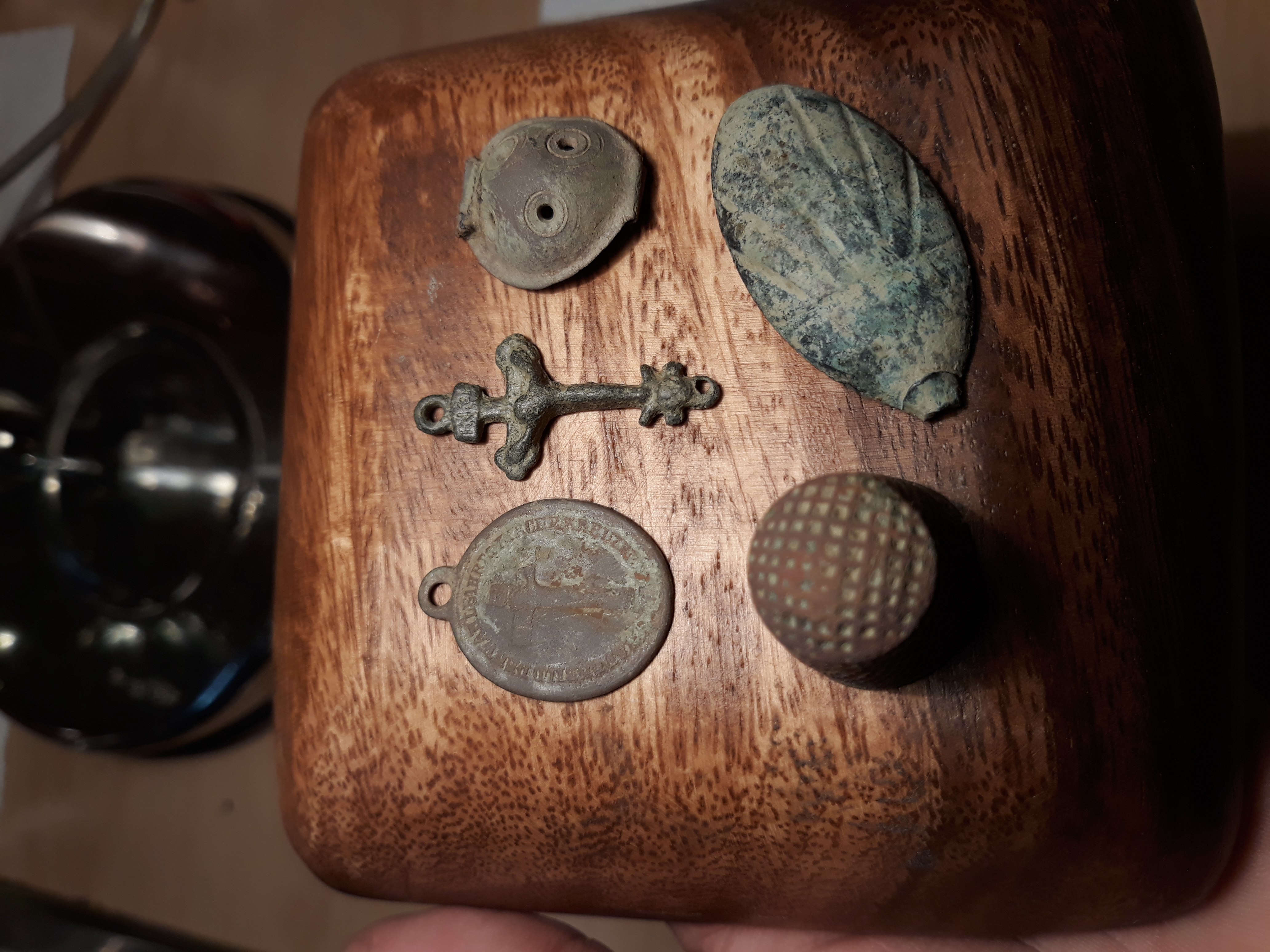 Das "Ding" mit der Blume fotografier ich heute nochmal besser. War gestern schon dunkel. Erst dachte ich es wäre ein Knopf, aber es hat keine Öse oder Ösenrest. Dafür einen ganz kleinen Rest auf der Seite der Unterseite von etwas. Von der Rückseite kommt später noch ein Foto.