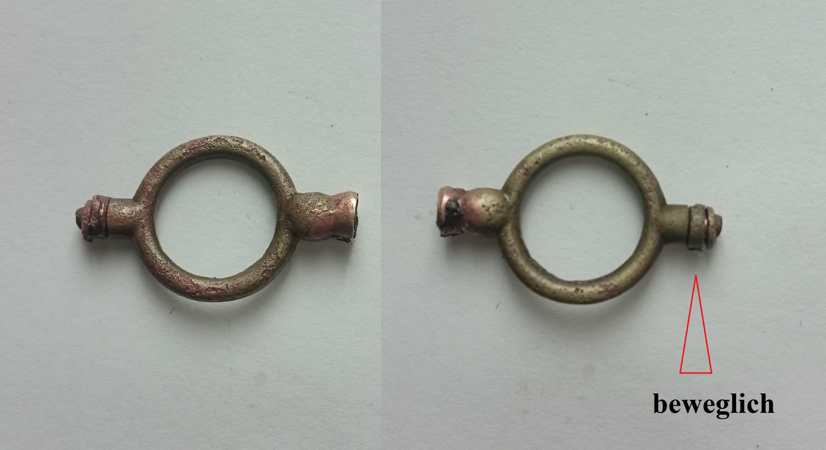 - Kupfer, ein Kettensegment im Ring festgerostet, 2 durchlaufende Einbuchtungen seitlich am Fuß
