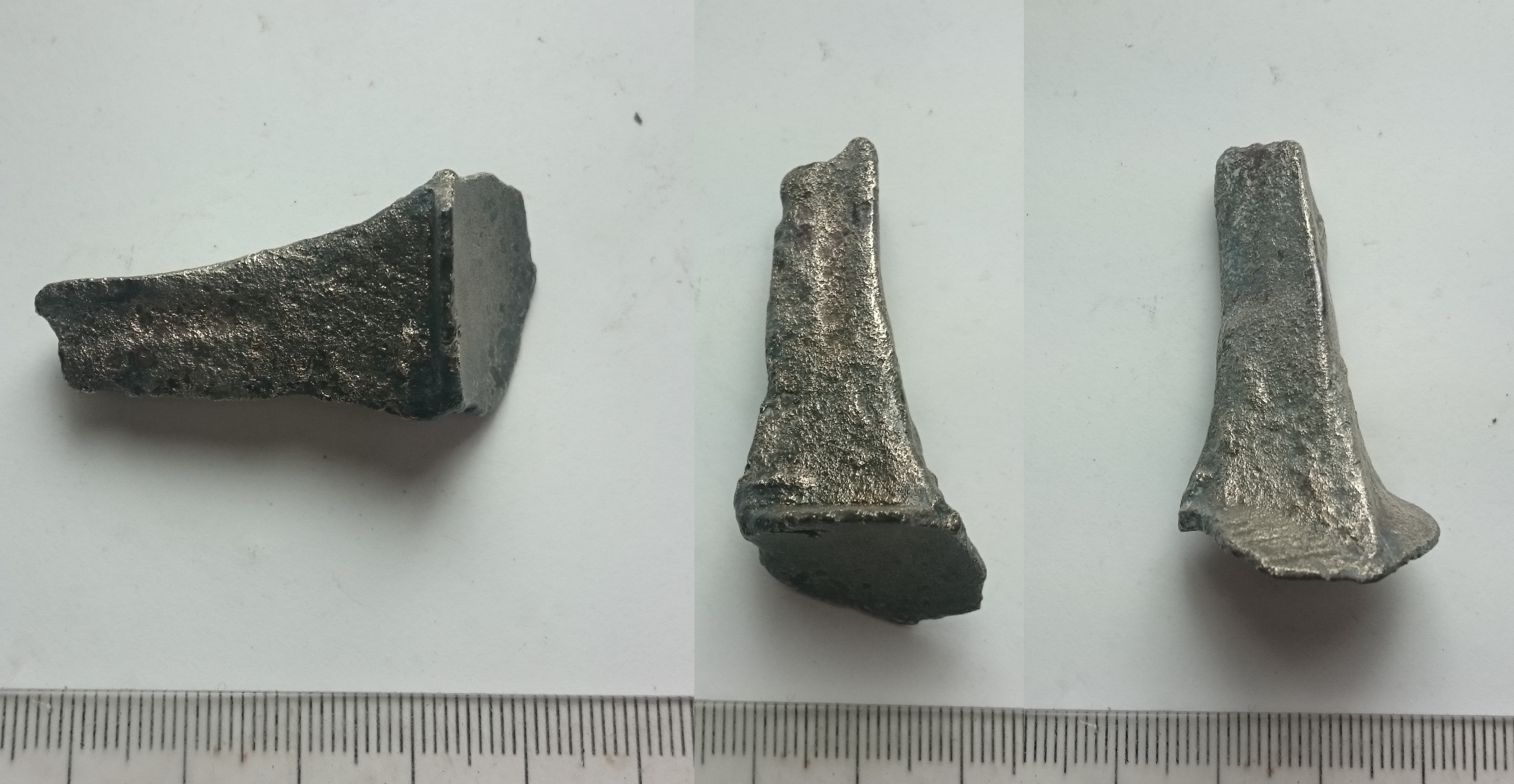 Habt ihr eine Meinung dazu? Ich bin ratlos. Man beachte die Millimeterskala daneben. Material unbekannt. War ein weißlicher Klumpen beim Fund. Nach der Entrostung sieht es jetzt so aus.