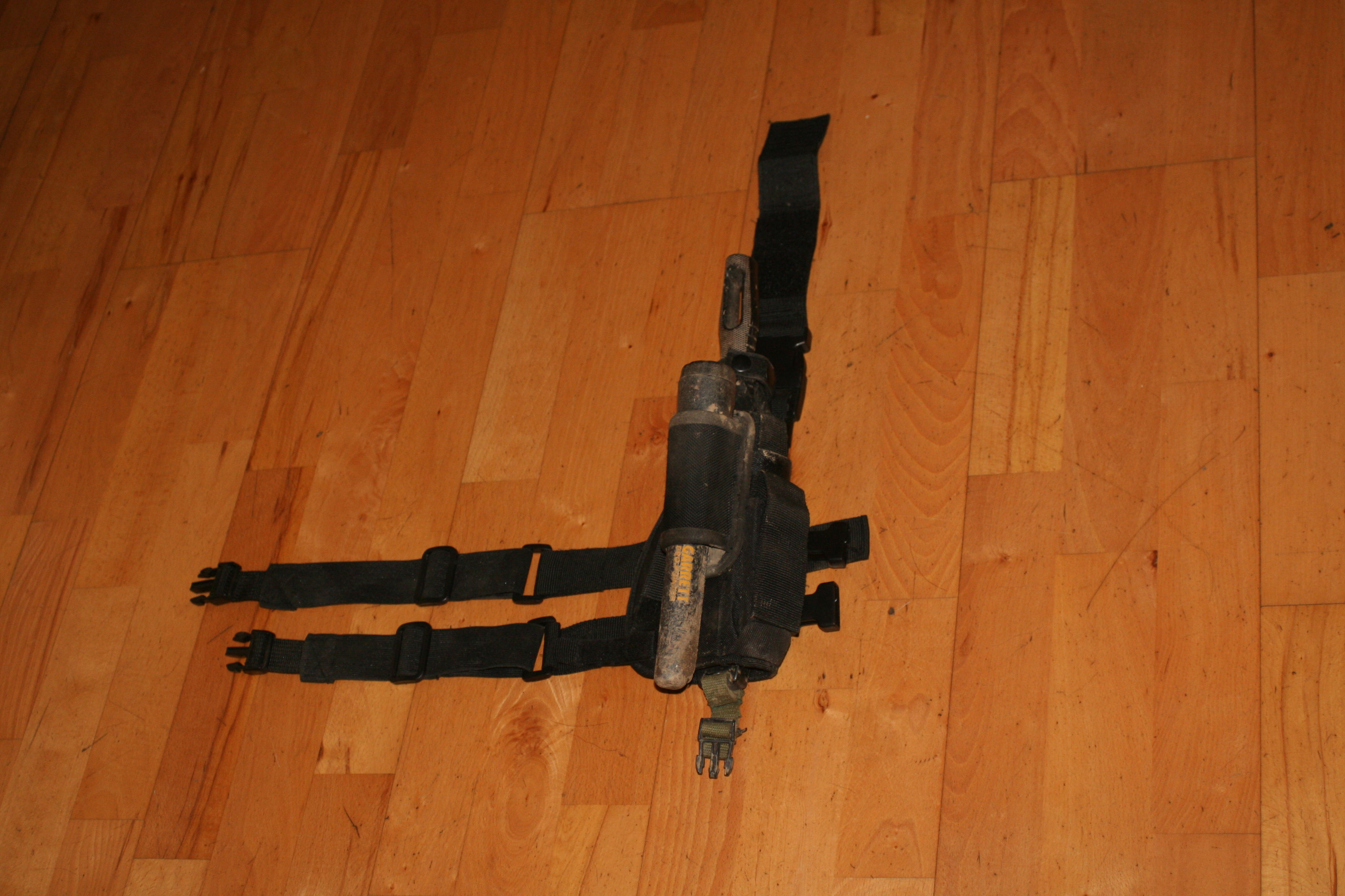 Die obere Schlaufe wird mit einem Klickverschluss am Gürtel befestigt und die Beinschlaufe hat einen Klettverschluss.