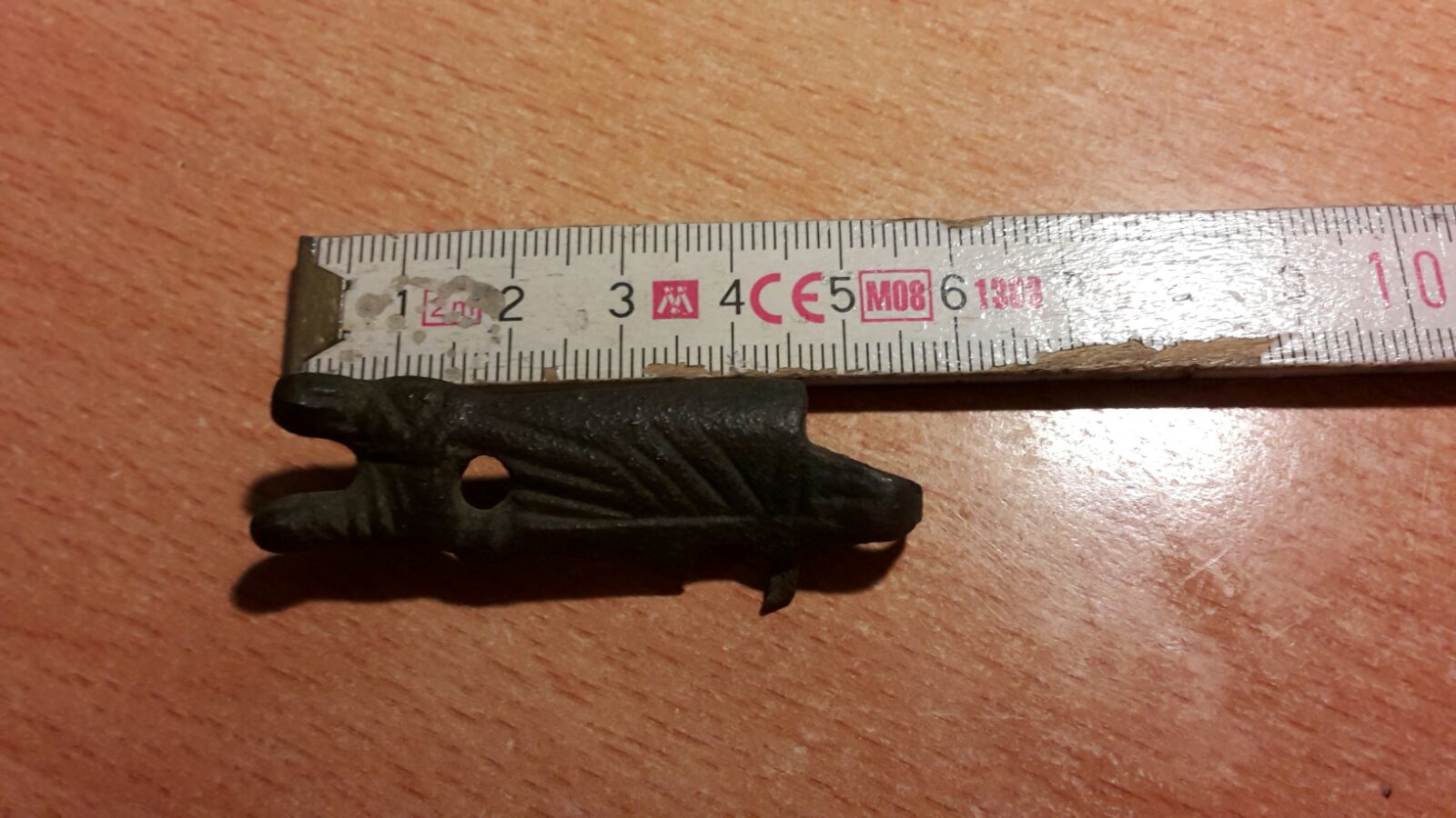 Nordischerkreis hat geschrieben:Ist ein früh-neuzeitlicher Schlüsselhaken. Sollen zwei Personen sein (Ehepaar) die neben einander stehen. Gürtelhaken ist abgebrochen auf der Rückseite. Nr. 10