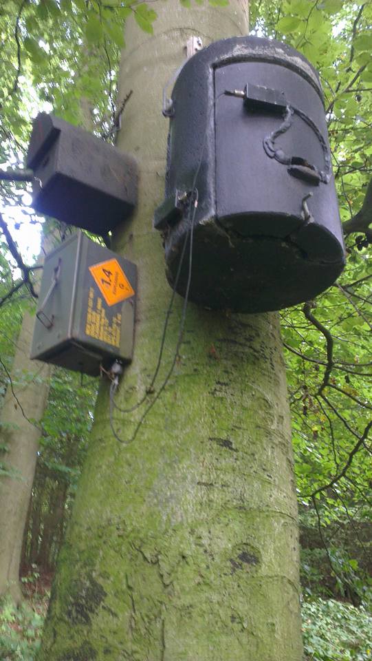 Der große Behälter rechts erinnert mich an eine Künstliche Behausung für Eulen und Käuze, die Hängen bei uns auch im Wald allerdings in einer anderen Farbe.