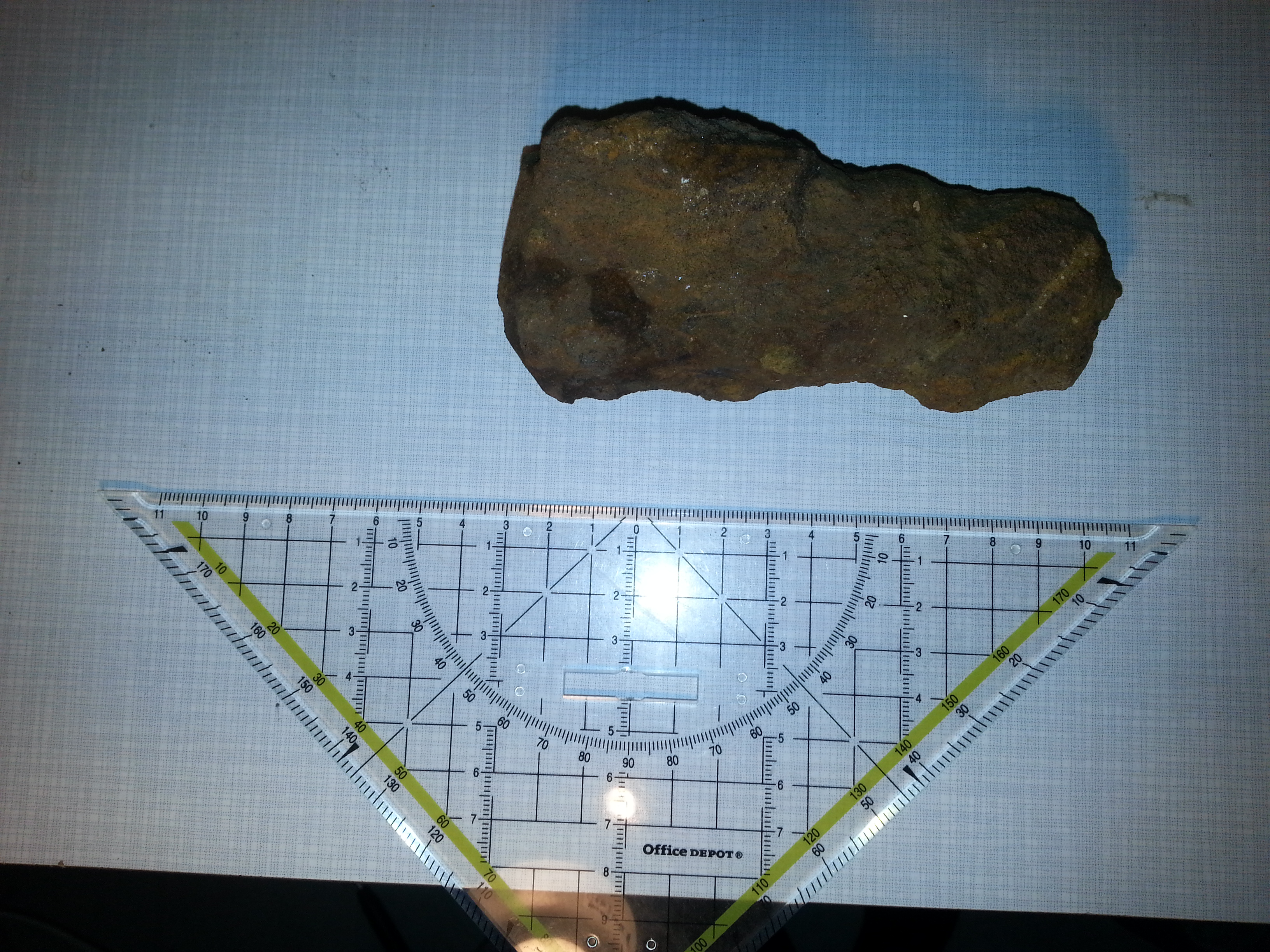habe diesen Stein vor ein paar Tagen auf dem Acker gefunden . Es ist ca 14 cm lang und wiegt 801 Gramm. Es fühlt sich für die Größe sehr schwer an .