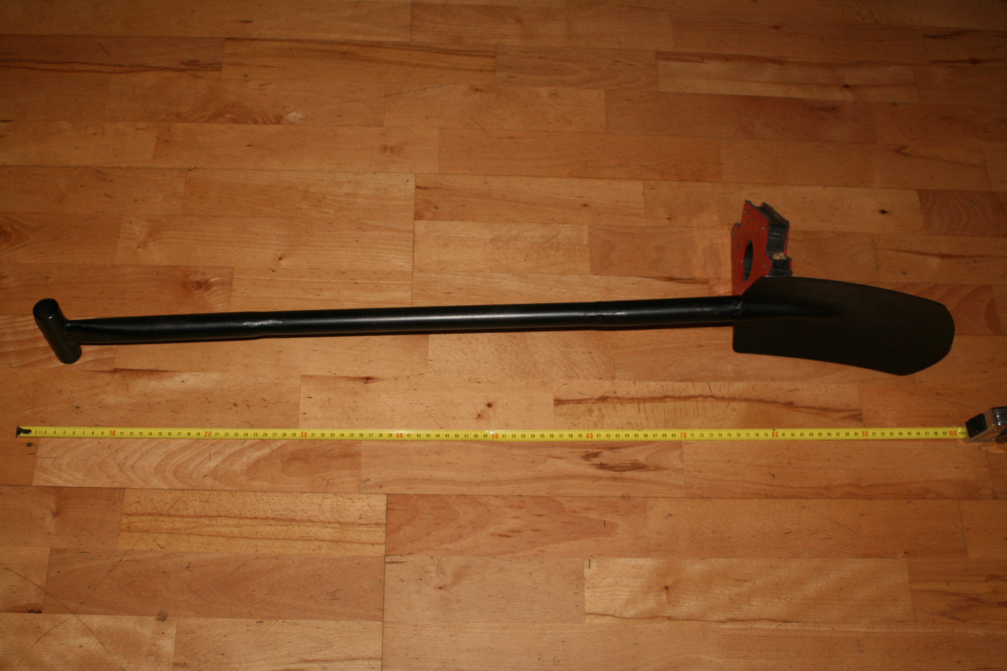 Wenn ich den Stiel etwa in der Mitte teile, einen Bolzen mit Bohrung einschweisse und in die Hülse des anderen Teils eine Bohrung für eine Schraube mache... dann hätte ich einen zerlegbaren Spaten mit zwei Teilen a ca. 55 cm.