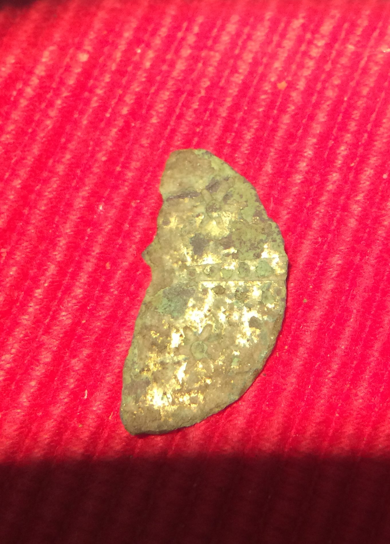Kuerzlich fand ich dieses Teil. Material vermutlich Messing, Rueckseite Platt. Man erkennt einen waagerechten Streifen mit eingeschlagenen Punkten sowie unten und oben vermutlich ein Blumenmotiv.