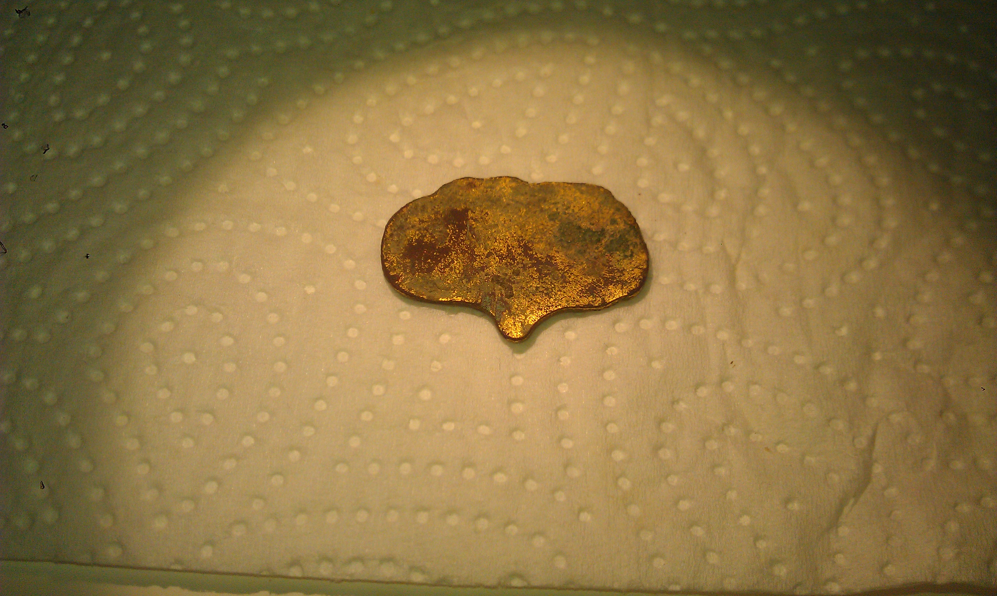 dieses Schmuckstück wurde gestern auf einem Acker gefunden. Kann es jemand einordnen? Als Anfänger wäre ich auch um Tipps zur Restaurierung glücklich. Sieht mir aus, als wäre das Stück vergoldet und hat sich im Lauf der Zeit eine Grünspan-Schicht abgeholt.