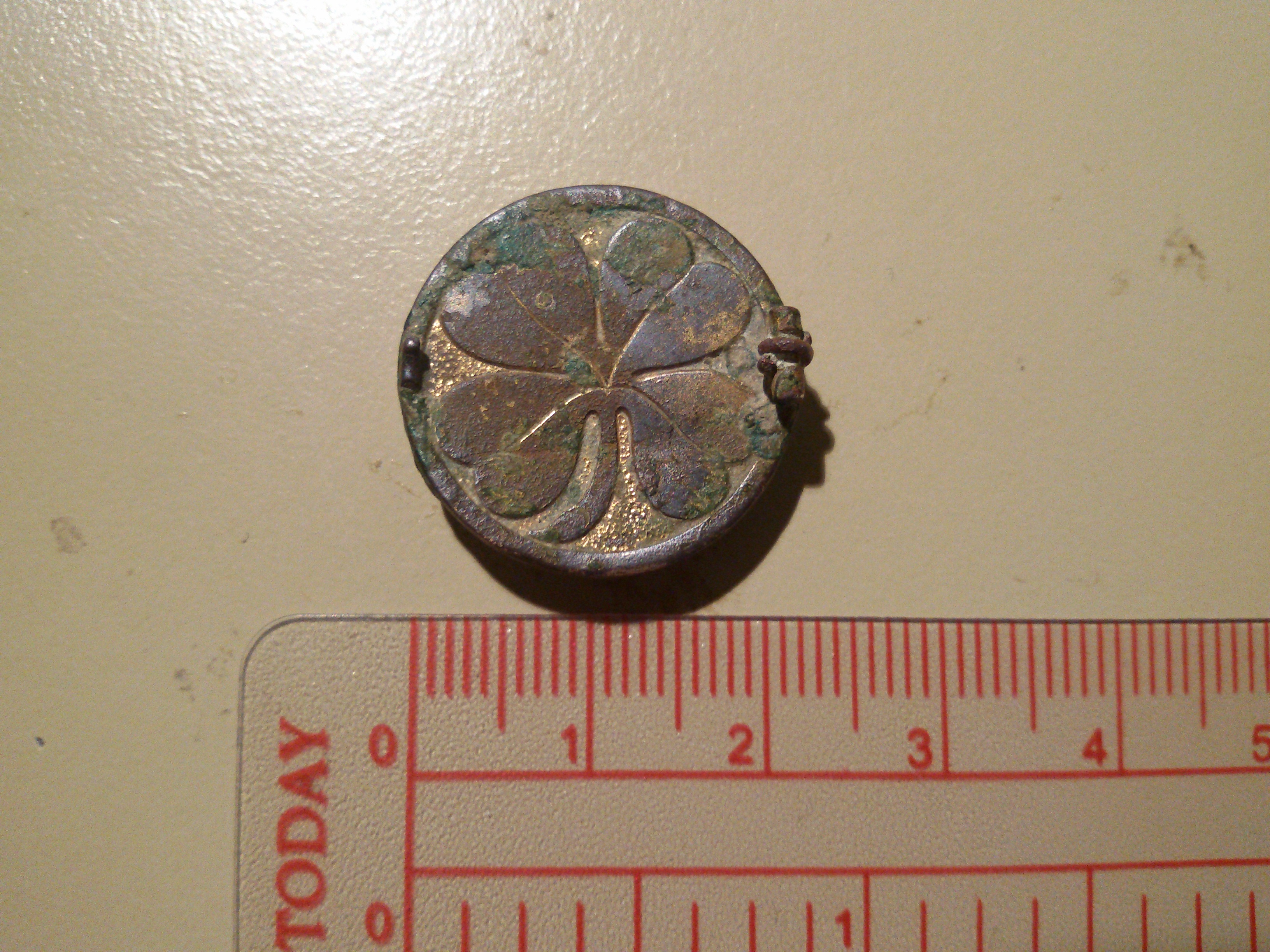 Außenseite halbrund, weiß, höchstwahrscheinlich Kunststoff. Innenseite: Messing, ein vierblättriges Kleeblatt.
