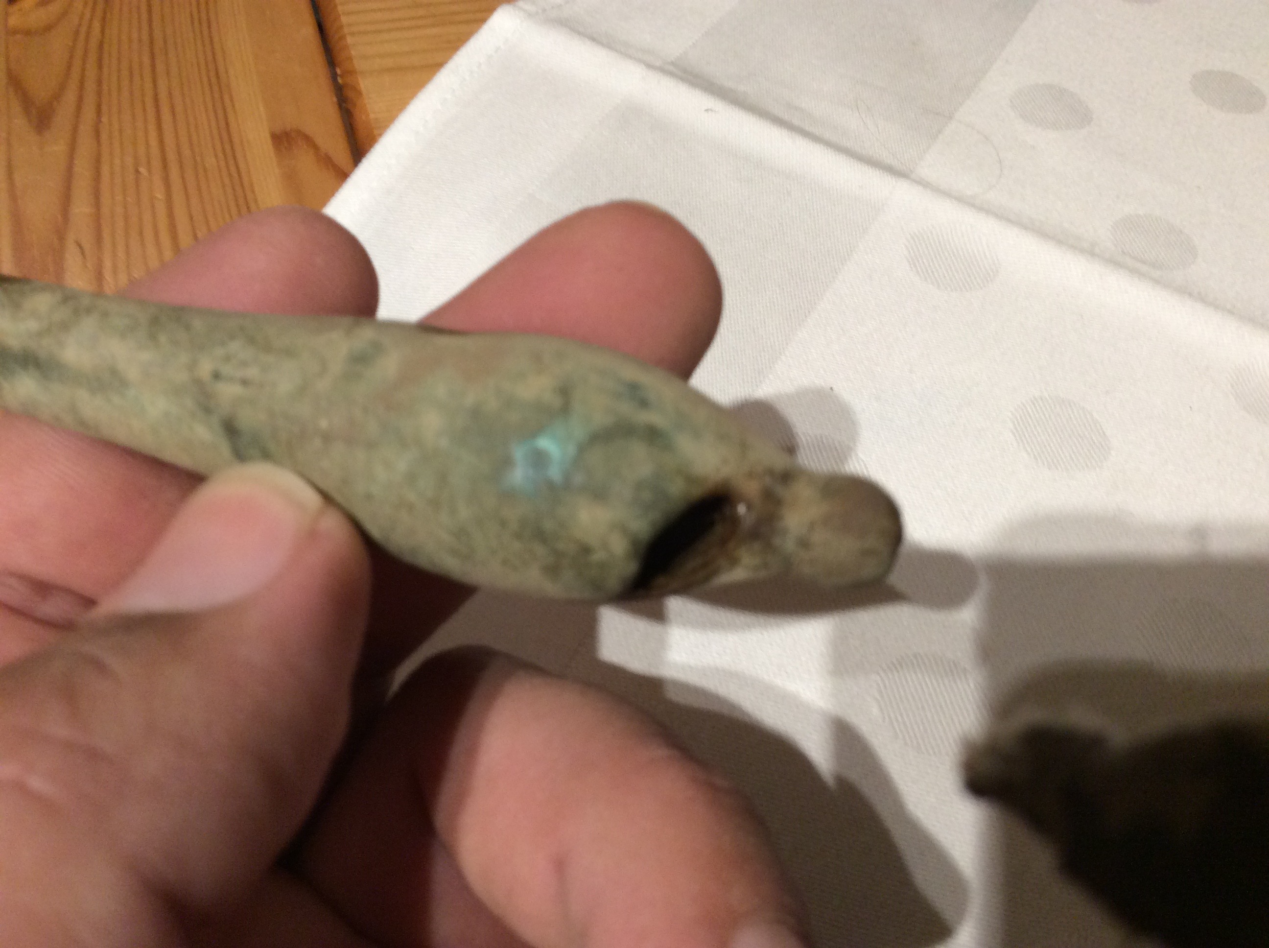 Was sich hierbei allerdings als verstörend erweist, ist das Loch am Pommel.Entweder mit einem Loch und Pommel, oder durchgängig hohl, ohne Pommel.Dieser wurde dann nach dem Aufschieben des Griffklobens, mittels Gewinde am Ende aufgeschraubt.