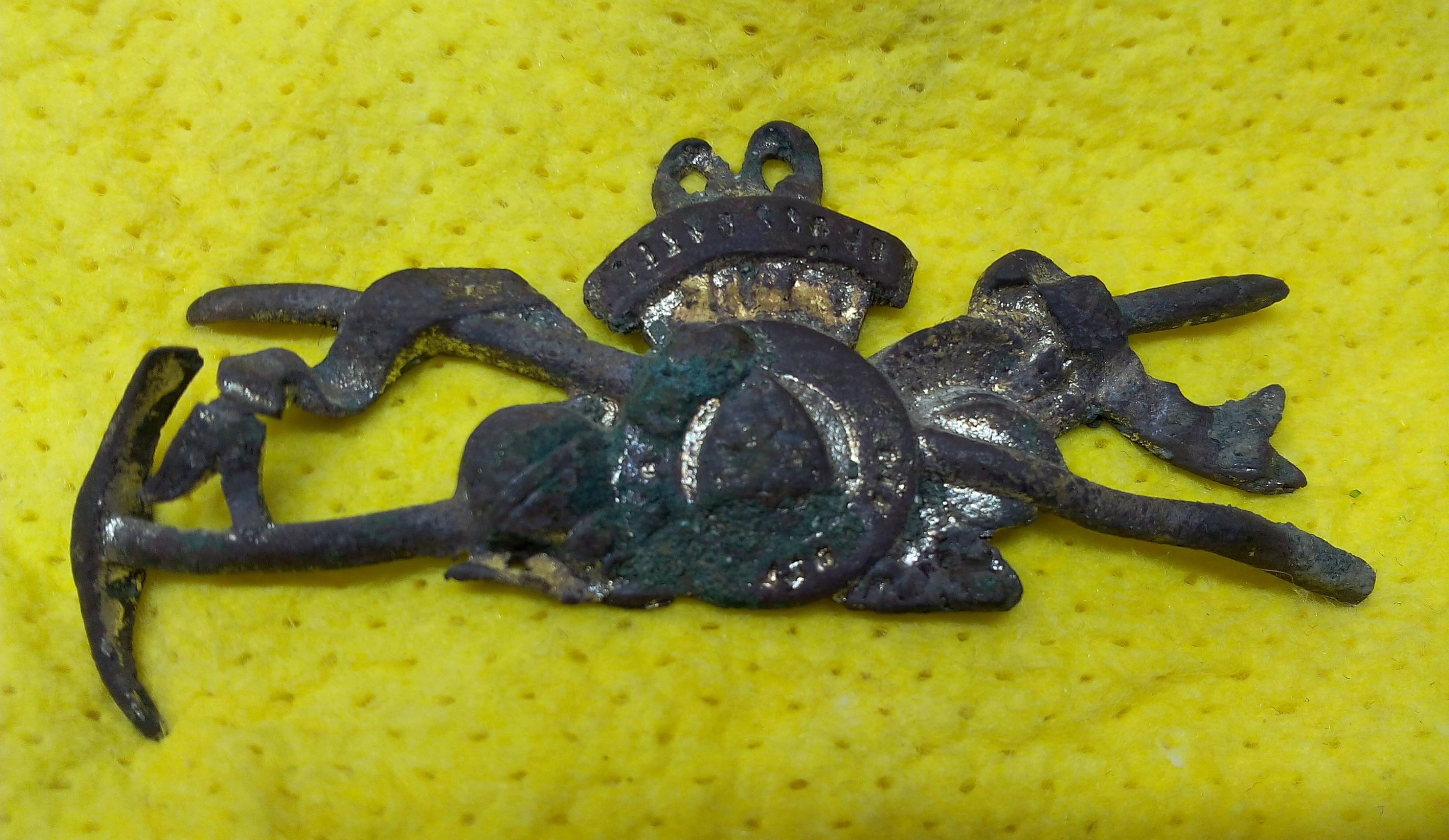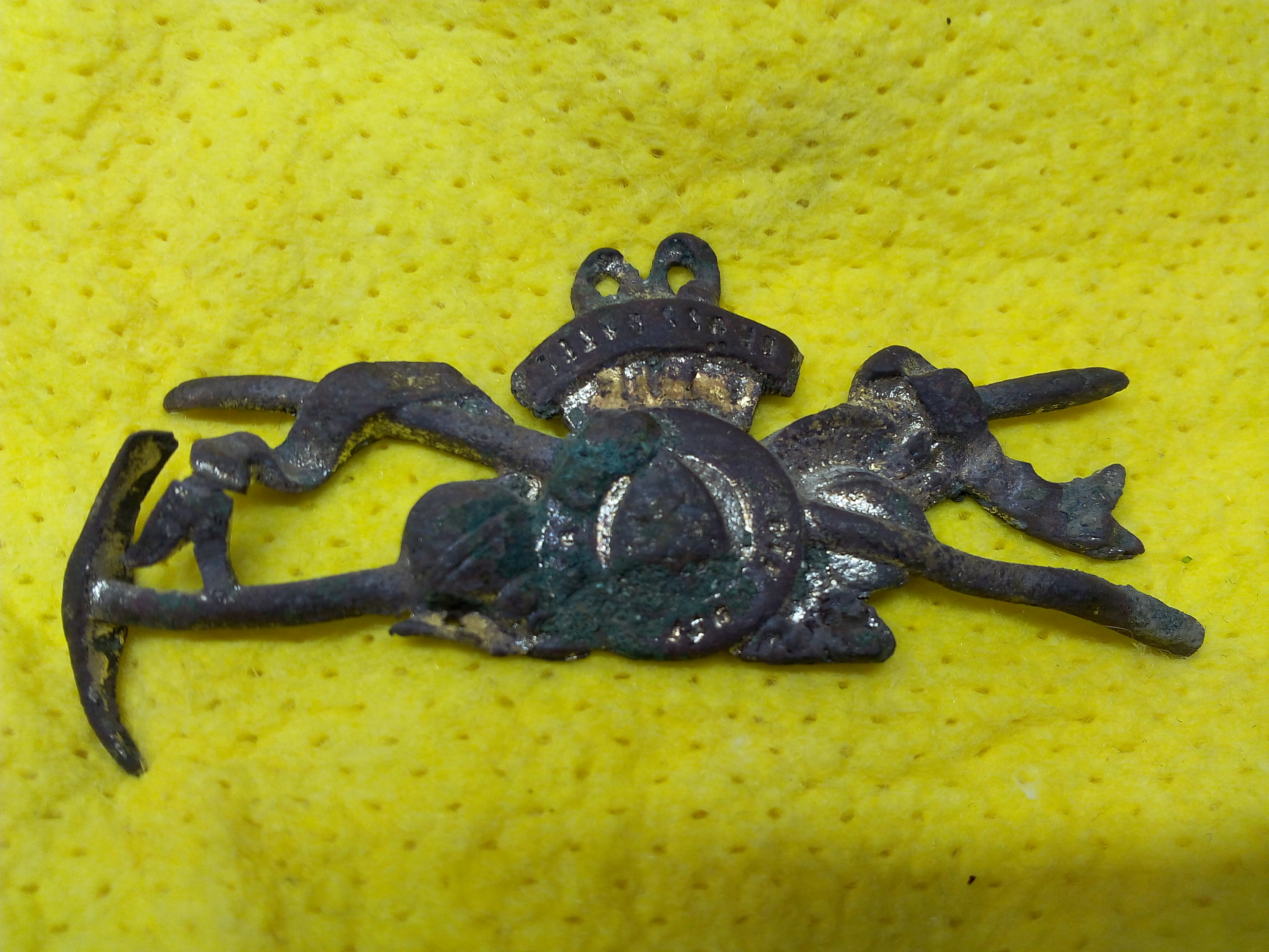 Dieses Abzeichen habe ich an einem angrenzenden Bundesheergelände gefunden. Dachte deswegen zuerst an ein altes Bundesheerabzeichen - Gebirgsjäger oder so. Aber ein selbst ein alter Bundesheeroffizier a.D. konnte mir nicht weiterhelfen. Mit der Spitzhacke und könnte auch auf der anderen Seite eine Schaufel dargestellt gewesen sein, wobei von der Schaufel nur mehr der Stiel vorhanden sein könnte. Dann würde es eher für ein Bergarbeiterabzeichen sprechen. Oben in der Mitte sind zwei Löcher oder Aufhänger. Darunter und im kreisförmigen Emblem befindet sich ein Schriftzug, der sich leider nicht entziffern lässt. Das Teil dürfte aus Messing sein (von der Schwere und Klang her) und war zumindest teilweise goldfarben. Würde dieses Abzeichen professionell reinigen lassen, um wenigstens die Schrift zu entziffern. Wer macht so etwas?