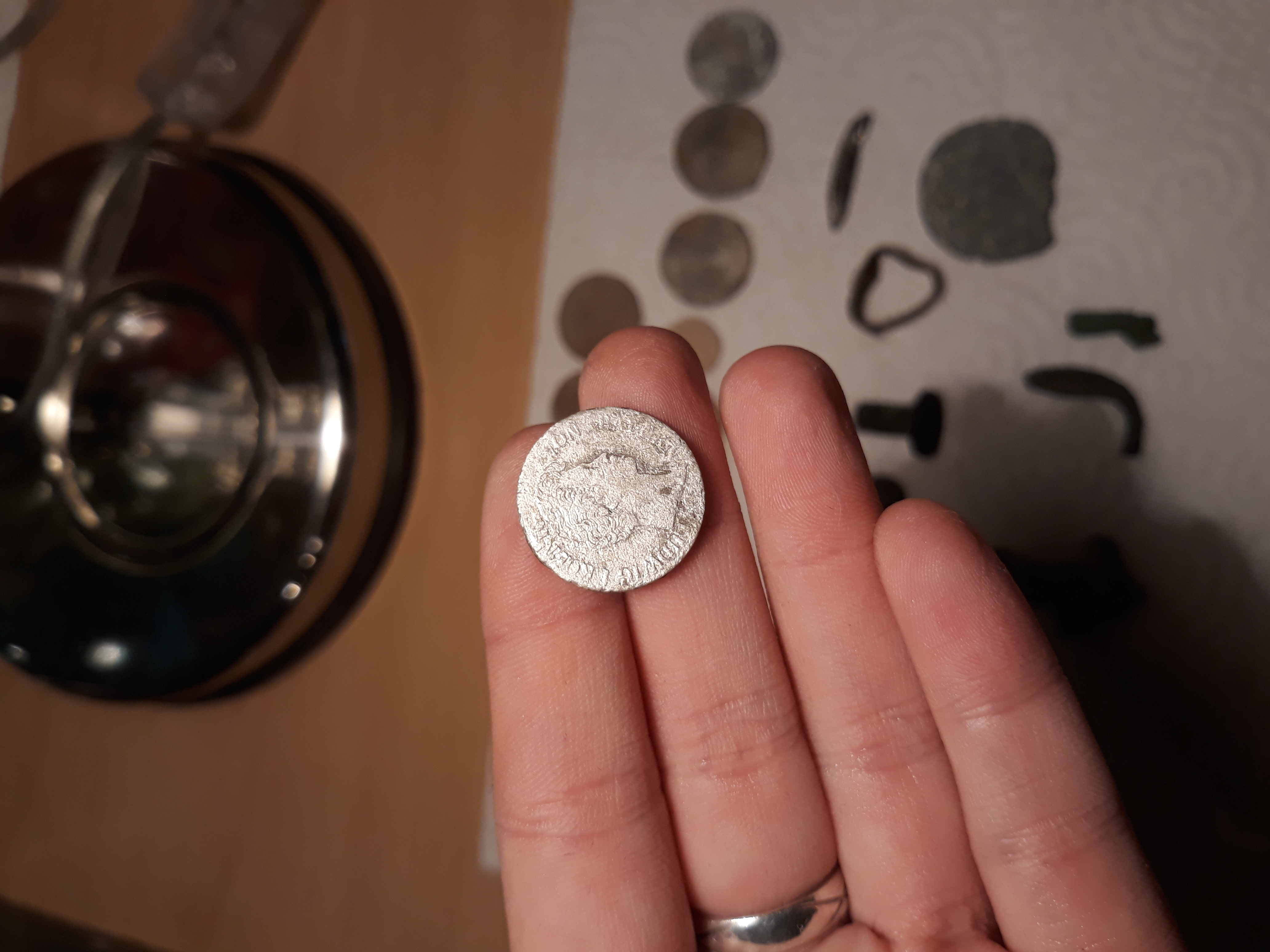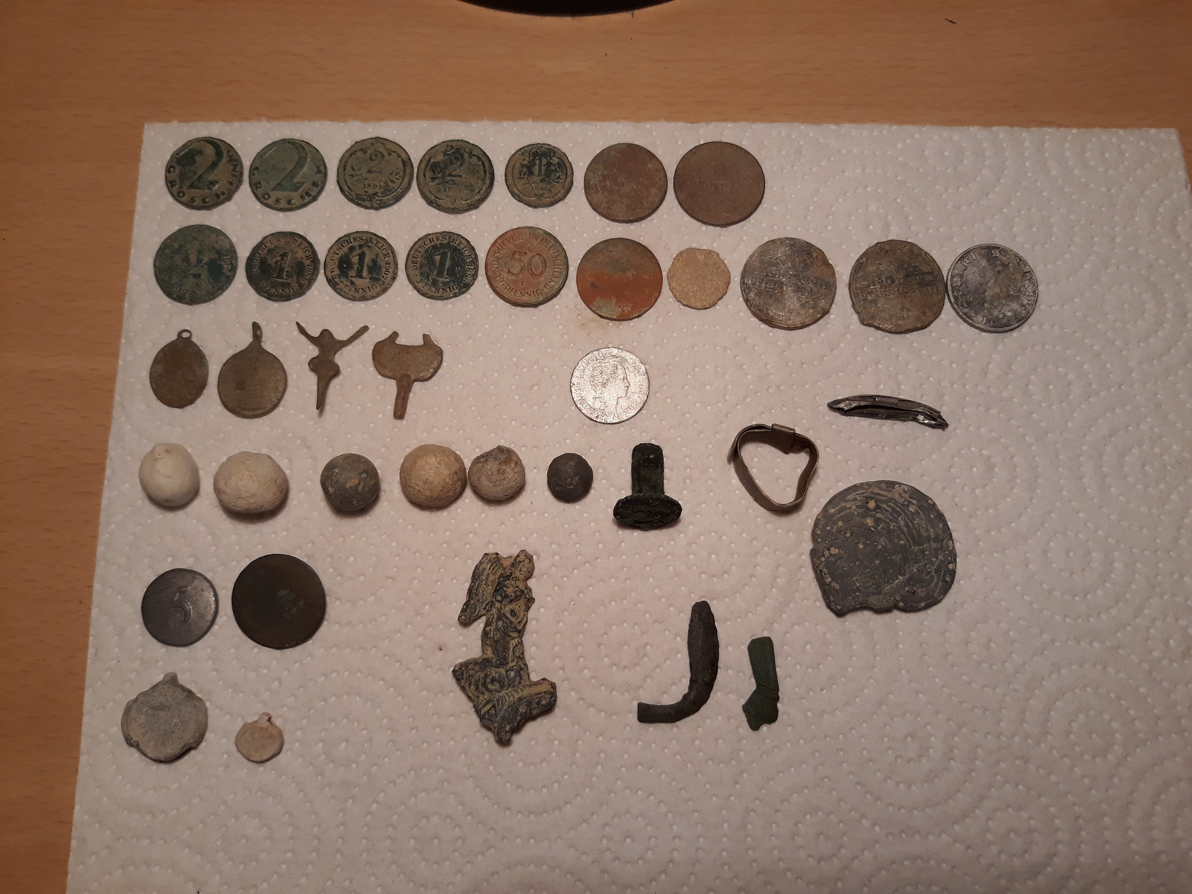Das Feld liegt im Grenzbereich Österreich - Deutschland. Gegenüber stand ca. 100 Jahre eine alte Schule. Der Bauernhof ist der älteste in diesem Landkreis. Ein Wegkreuz steht am Rand des Feldes. Die Auswahl des Feldes spielt eine sehr große Rolle, die vorherigen Punkte tragen meist zum Erfolg bei. Laut Bauern (sein Hof steht direkt am Feld), hat hier noch niemand gesondelt. Bodendenkmäler ca. 500 m entfernt. Es ist sehr groß..können also noch bestimmt 2 Wochen dort suchen. Ist ein Mais Feld, wo noch die Stoppel stehen. Zwischen den Reihen kann man super gehen und sich sehr gut orientieren wo man schon war. Über den Winter wird es nicht angepflanzt, nur noch einmal gepflügt. Was super ist, dann können wir gleich nochmal drüber. Wir haben jetzt etwa 2/5 vom Feld. Bis jetzt insgesamt auf diesem Feld ca. 60 Münzen, 2 Silberne davon. Was das Silber angeht, ist es hier noch so gut, aber dafür schöne andere Dinge, wie Bechergewicht, Ringe, Heiligenanhänger, 2x Petschaft, Drehküken, schöne Kreuze, Reliquenanhänger mit Inhalt, 2 Spielmarken..usw. Schrott hält sich in Grenzen. Würde sagen jeder 3. Fund ist ein guter.