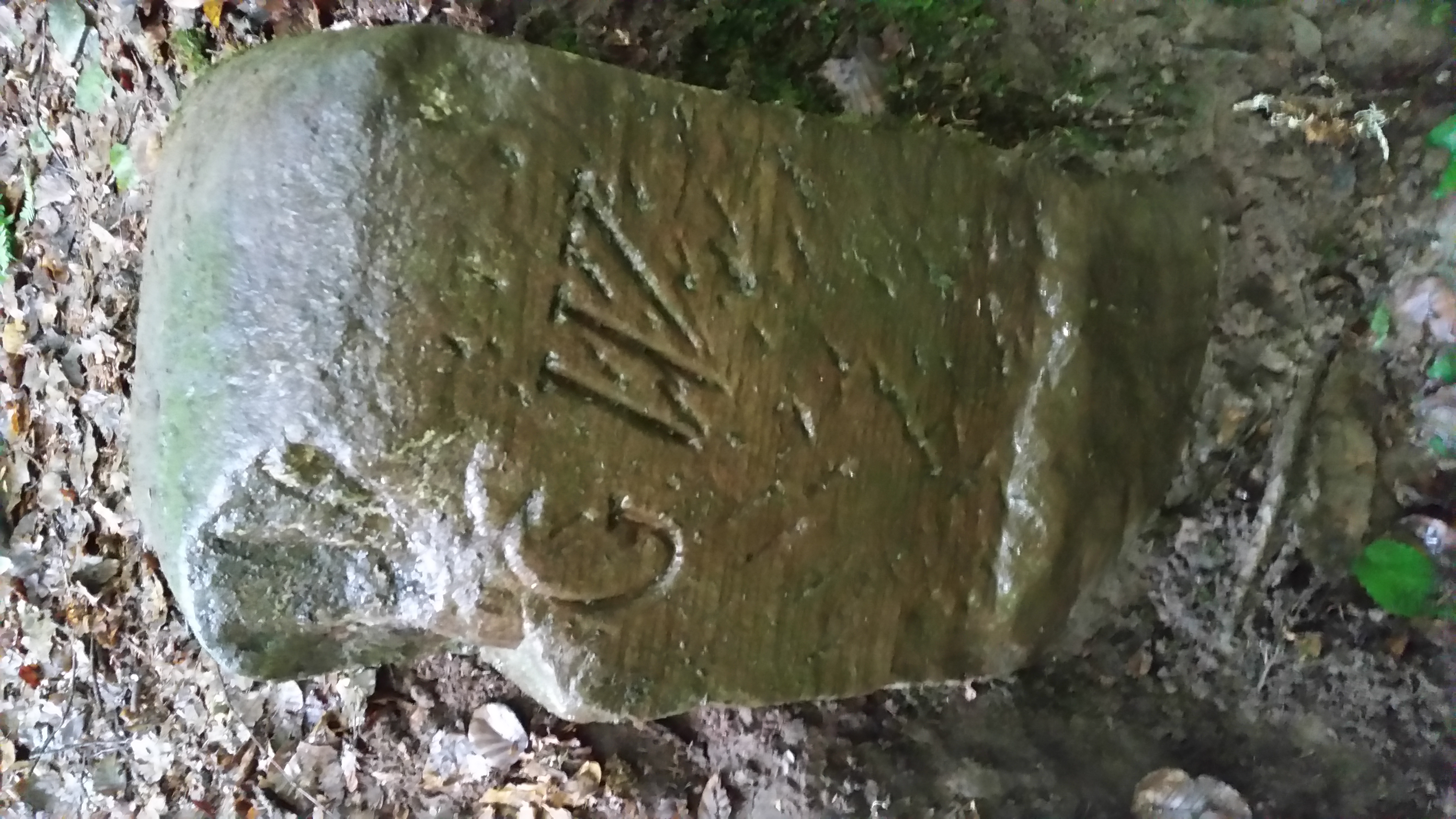 Steht oberhalb eines kleinen Bachlaufes und war mit Moos überzogen. Nachdem wir das Moos entfernt hatten kam dies zum Vorschein.