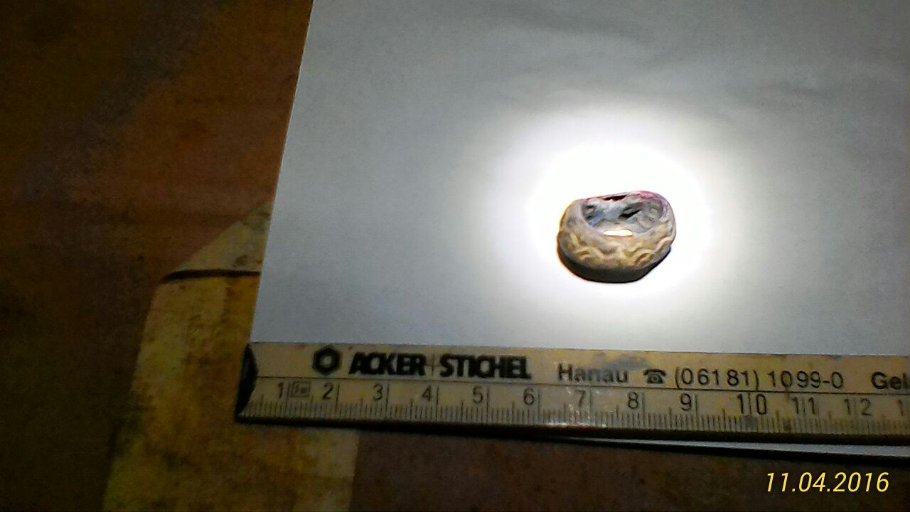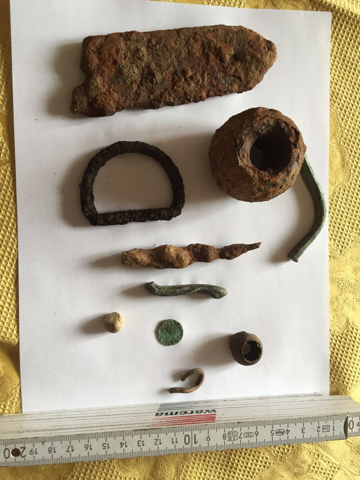 Ein kleiner Fundkomplex von heute. Sehr interessant ist die Schlange, was könnte das gewesen sein. Das große runde Ding mit Loch weiß ich leider auch nicht und das Teil mit den Verzierungen kann ich auch nicht identifiezieren. Die erste Musketenkugel hab ich auch gefunden. Gerne auch Hinweise was.der Rest sein könnte. Die Münze ist 1 Pfenning von 1880. Leitwert Rundes ding mit verzierungen 60. Leitwert Schlange 63. Leitwert. Leitwert kleines gebogenes Teil auch um die 60. Großes Teil mit Loch 39.