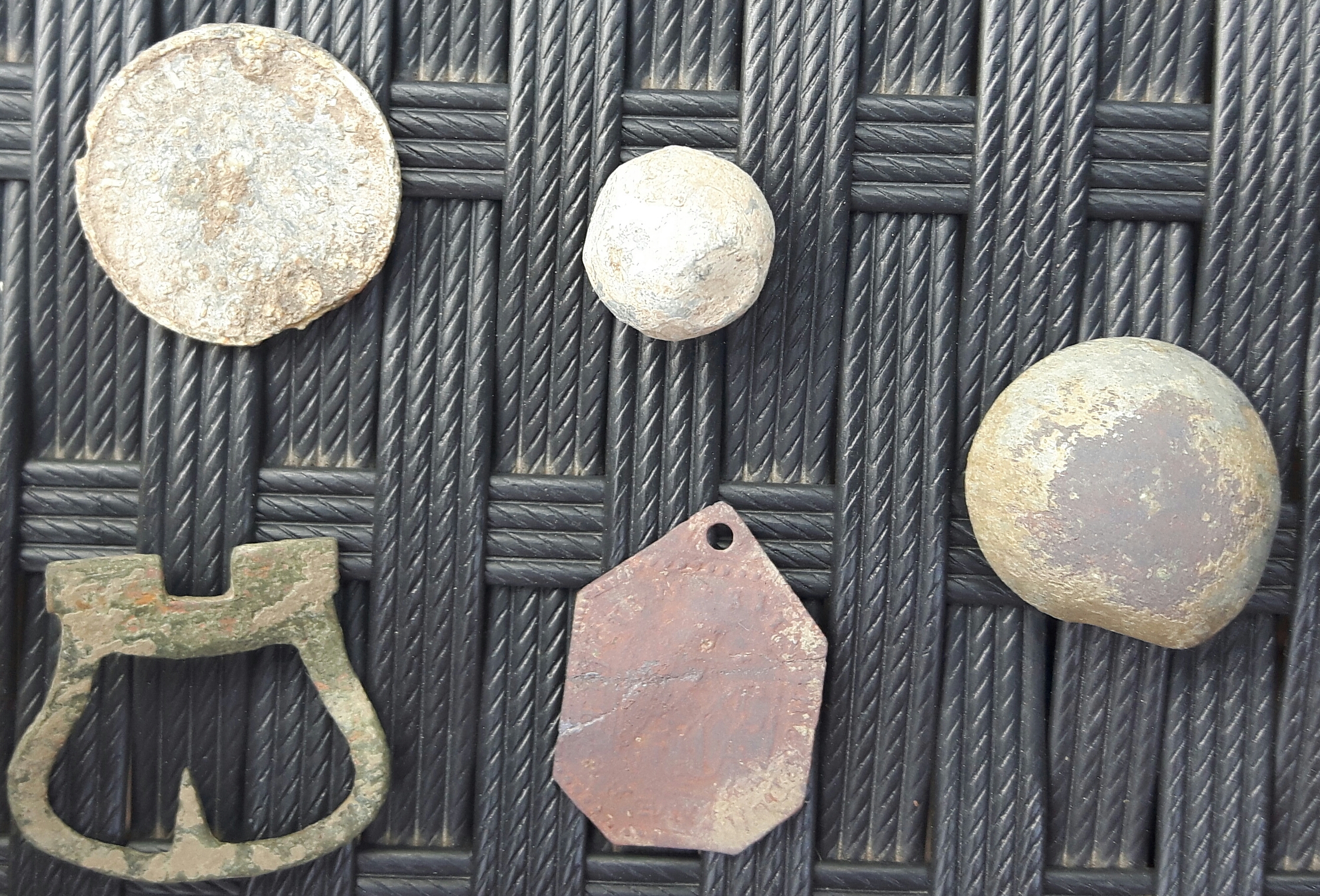 Eine Kupferschnalle, ein Knopf, ein interessanter Kupfer Anhänger den ich leider nicht zuordnen kann da er ziemlich mitgenommen ist die Schrift sieht aber alt aus, ein Reichspfennig und eine Vorderladerkugel
