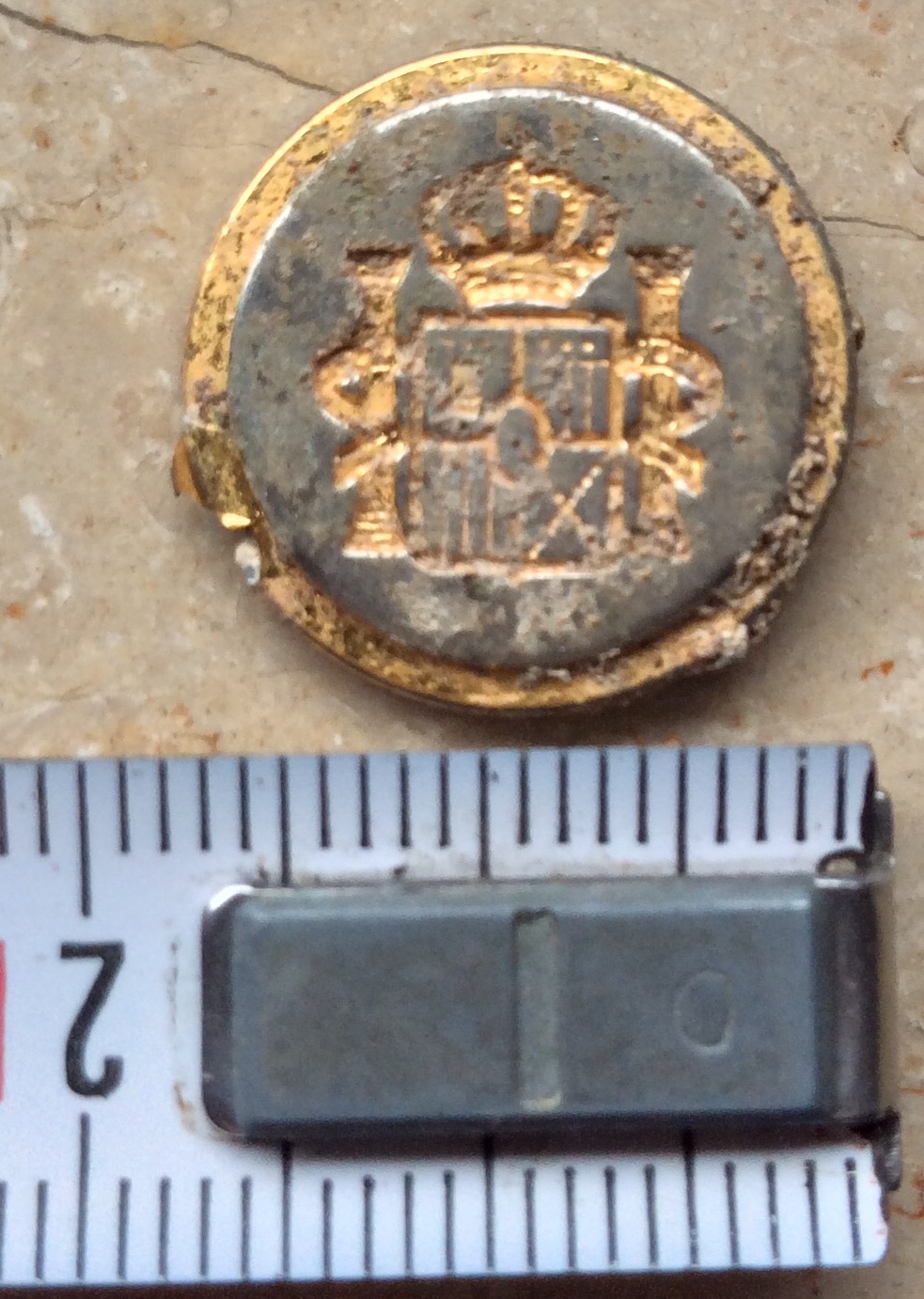 Hallo, habe einen golden Knopf oder Siegel gefunden den ich nicht einordnen kann. Das Wappen hat große Ähnlichkeit mit dem spanischen Königswappen aber ein paar Kleinigkeiten sind anders. Vielleicht kennt sich von Euch jemand damit aus und kann mir sagen was das ist. Dankeschön :D