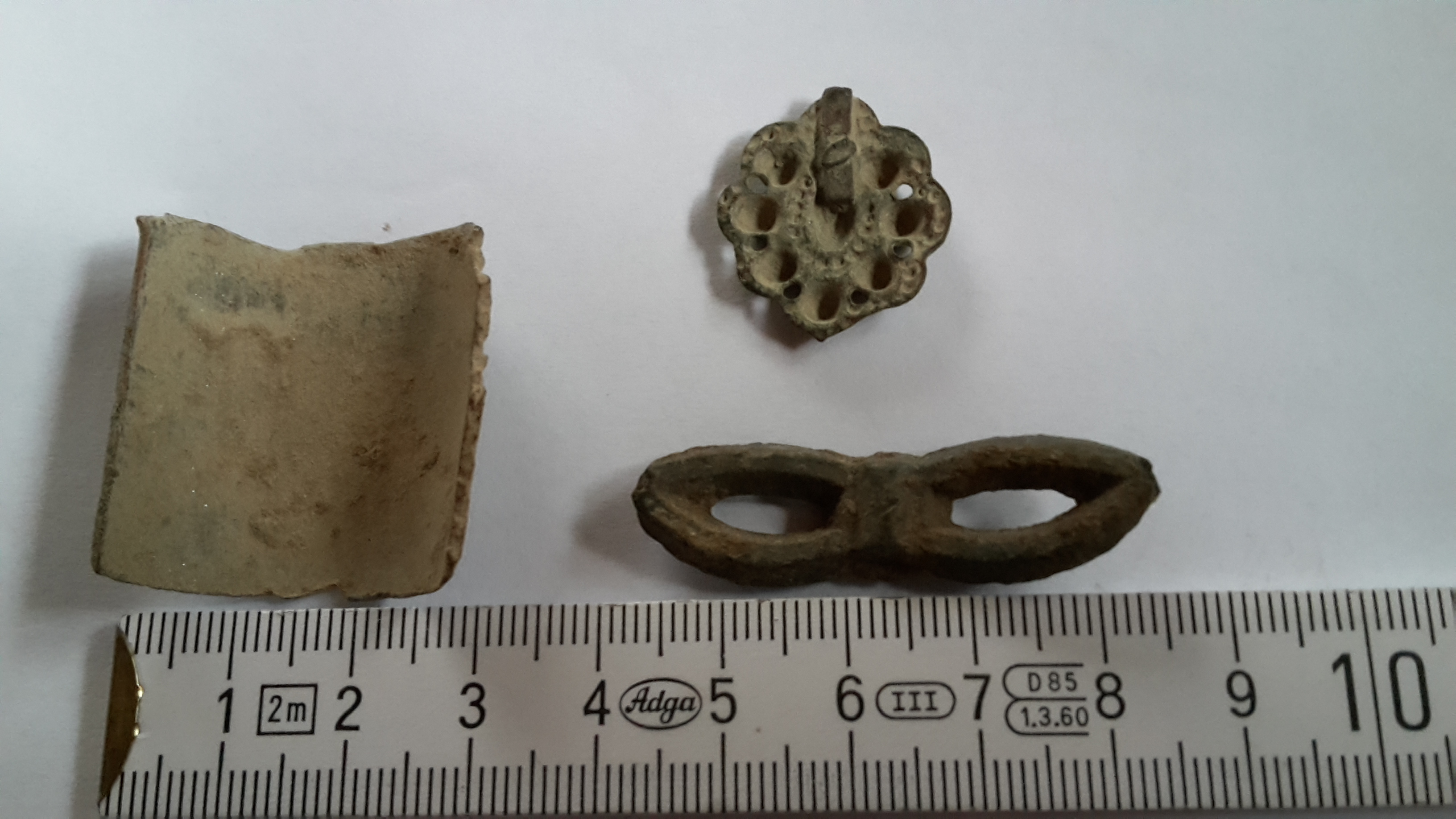 Bild 4: Das Bleiteil könnte ein Spinnwirtel sein - es gibt aber auch kleine römische Bleibarren! Das aus Keramik eine Tontaube - aber da haben wir bestimmt Schützenbrüder unter uns, die das wissen.