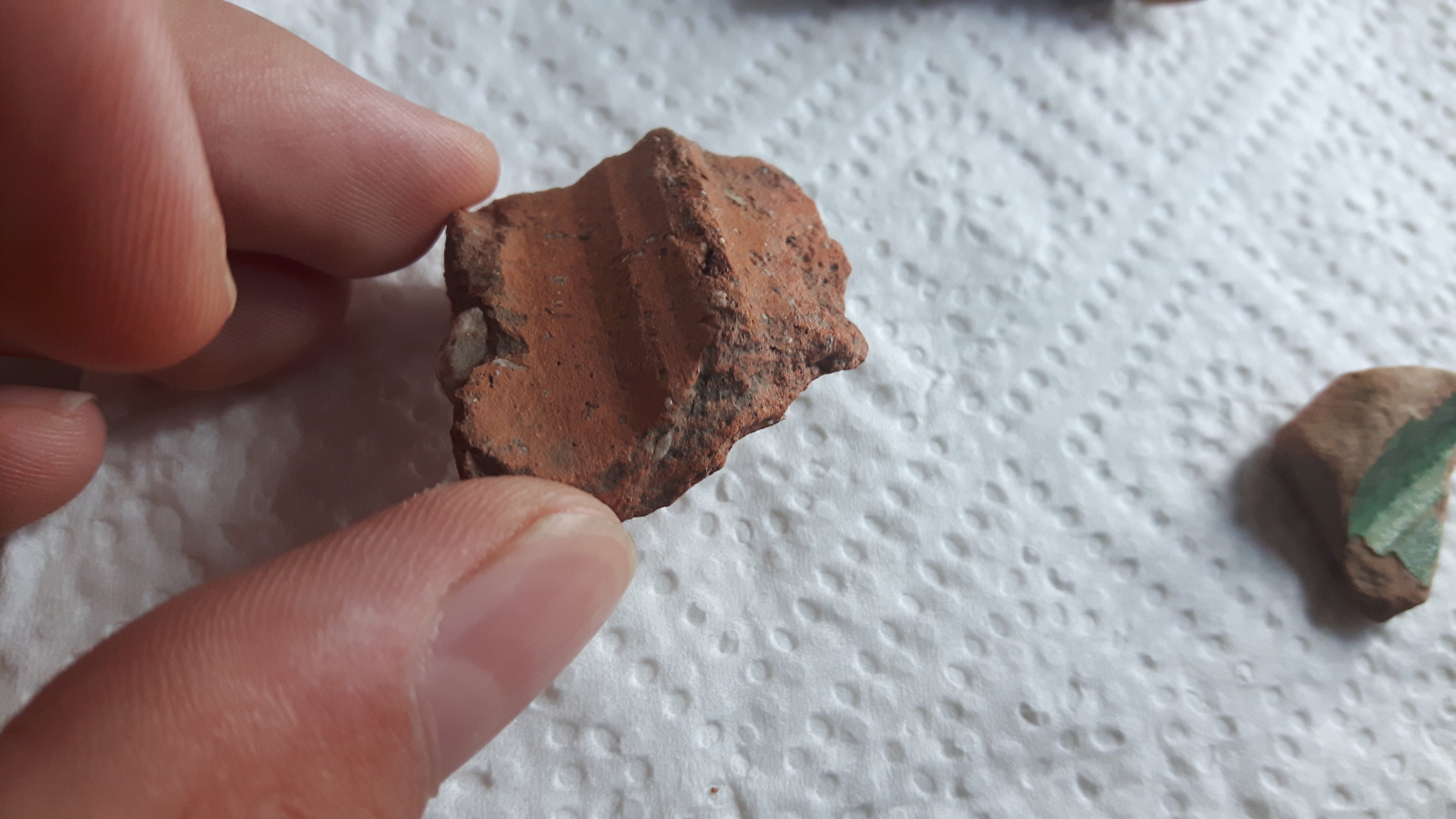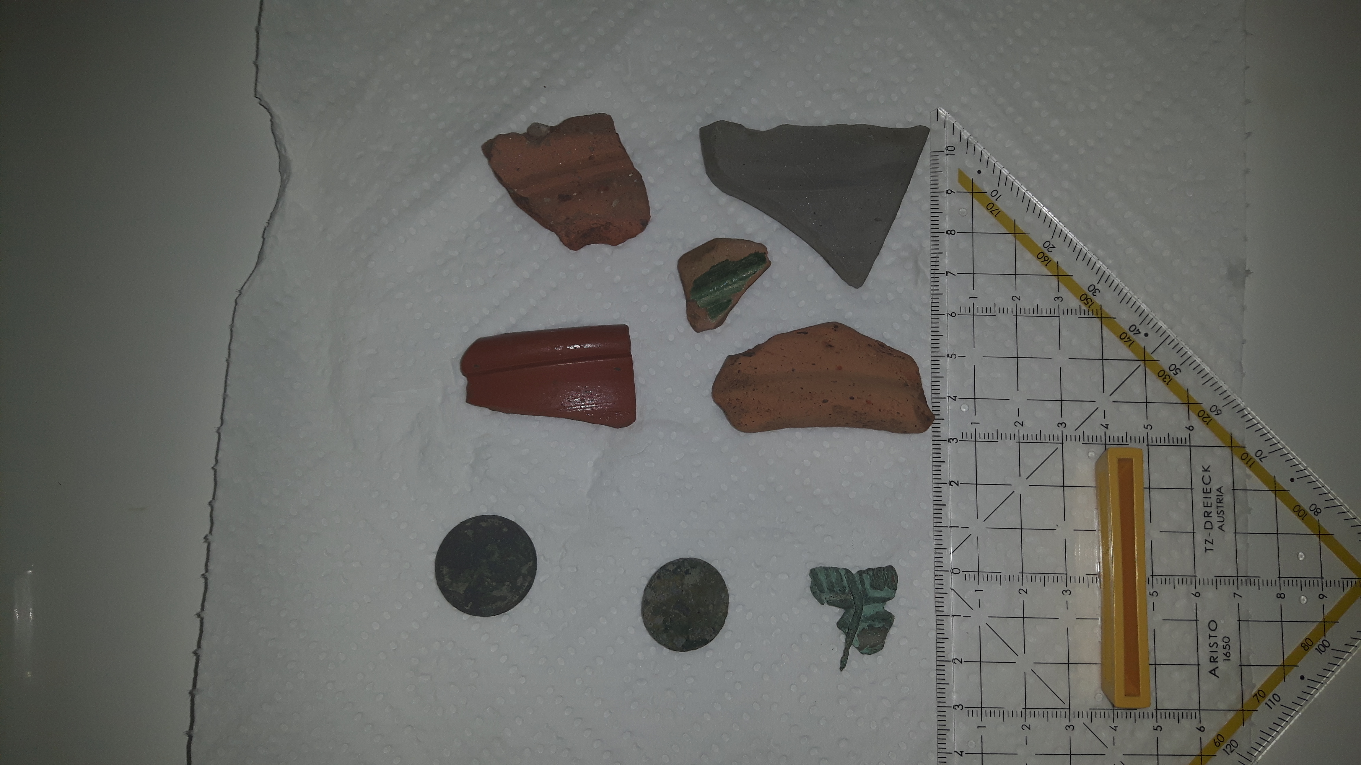 Die "rote Keramik" ist nach Autopsie der Bilder eventuell ein Randscherbe Terra Siggilata (Dragendorff 29 oder 37). Der Glanz spricht für südgallische Produktion als dann vermutlich Drag. 29 und in die gleiche Zeit zu datieren wie das Fibelfragment. Die Scherbe mit der grünen Glasur ist mittelalterlich oder neuzeitlich, der Rest nicht zu erkennen.