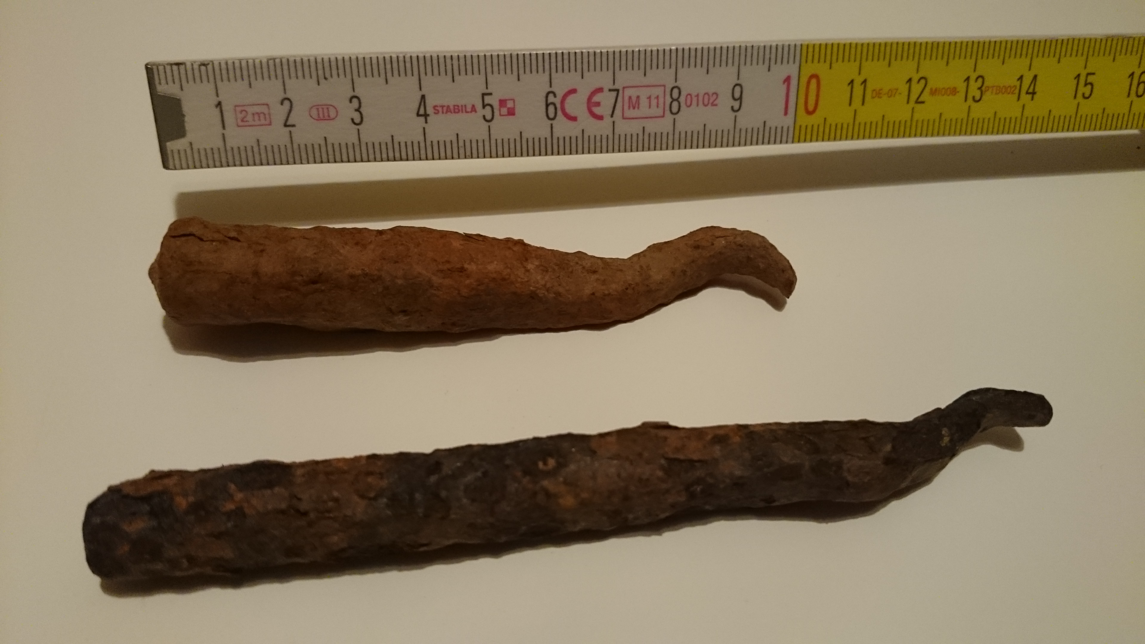 Hallo, abgebildet sind zwei sich verjüngende Bolzen, die vorne in etwa gleich gebogen sind. Diese wurden im Umkreis von ca. 1 km im Wald gefunden. Die Krümmung sieht bei beiden aus, als wäre sie gewollt so geschmiedet worden. Also eher keine auf etwas harte getroffene Geschoßspitze. Hat jemand eine Idee? Gruss aus dem Allgäu.