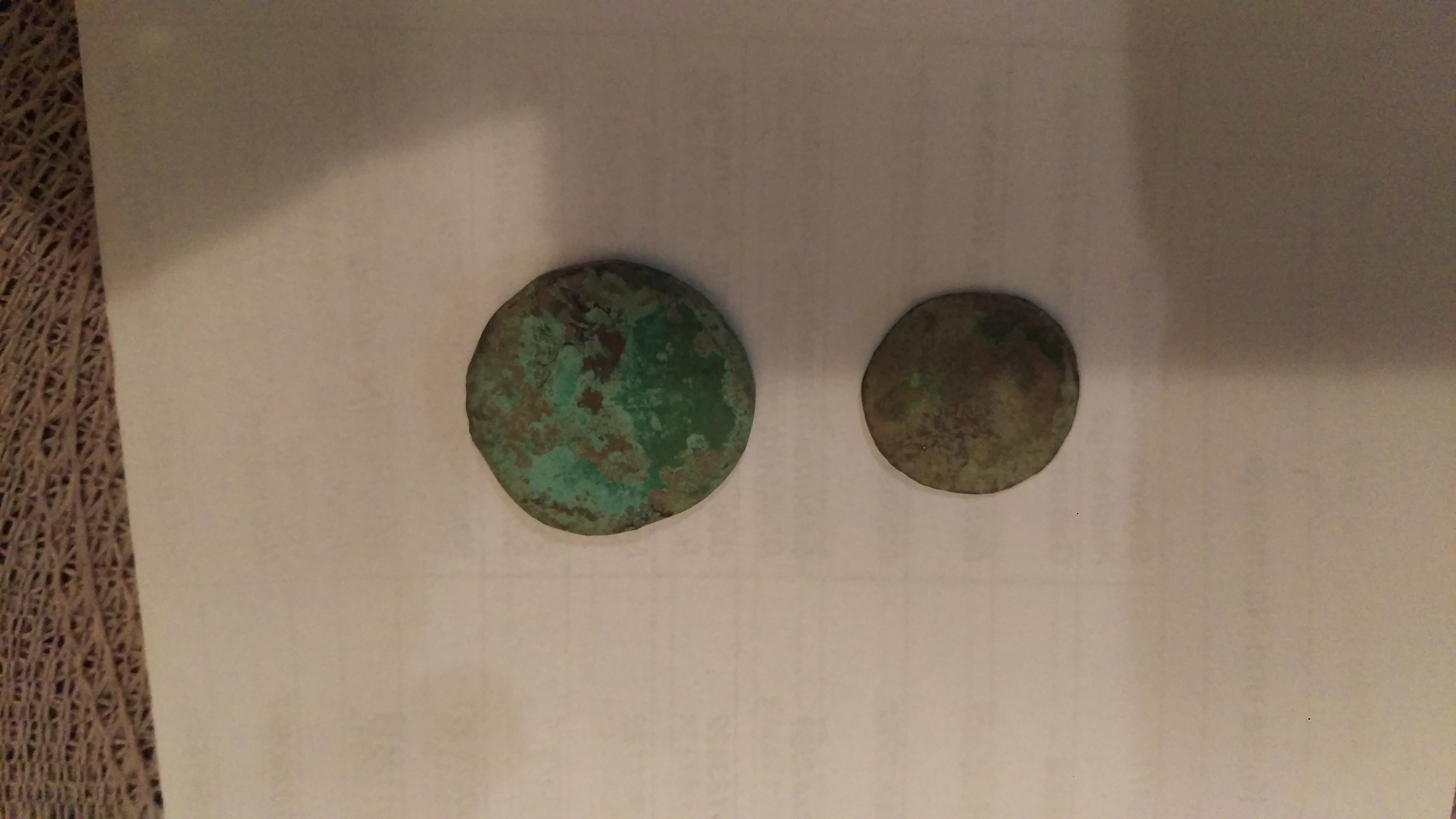 So wie es aussieht, sind das 2 Kupfer oder Bronze Münzen. Du solltest sie für 4-5 Tage in Petroleum eilegen und danach mit einer weichen Zahnbürste oder evtl. mit einem Zahnstocher (aus Holz) den aufgeweichten Dreck runter machen. Wenn sie denn zu dunkel ist, musst du sie für 15-20 Sekunden in einer Essig-Salz-Lösung legen, dass hellt sie auf.