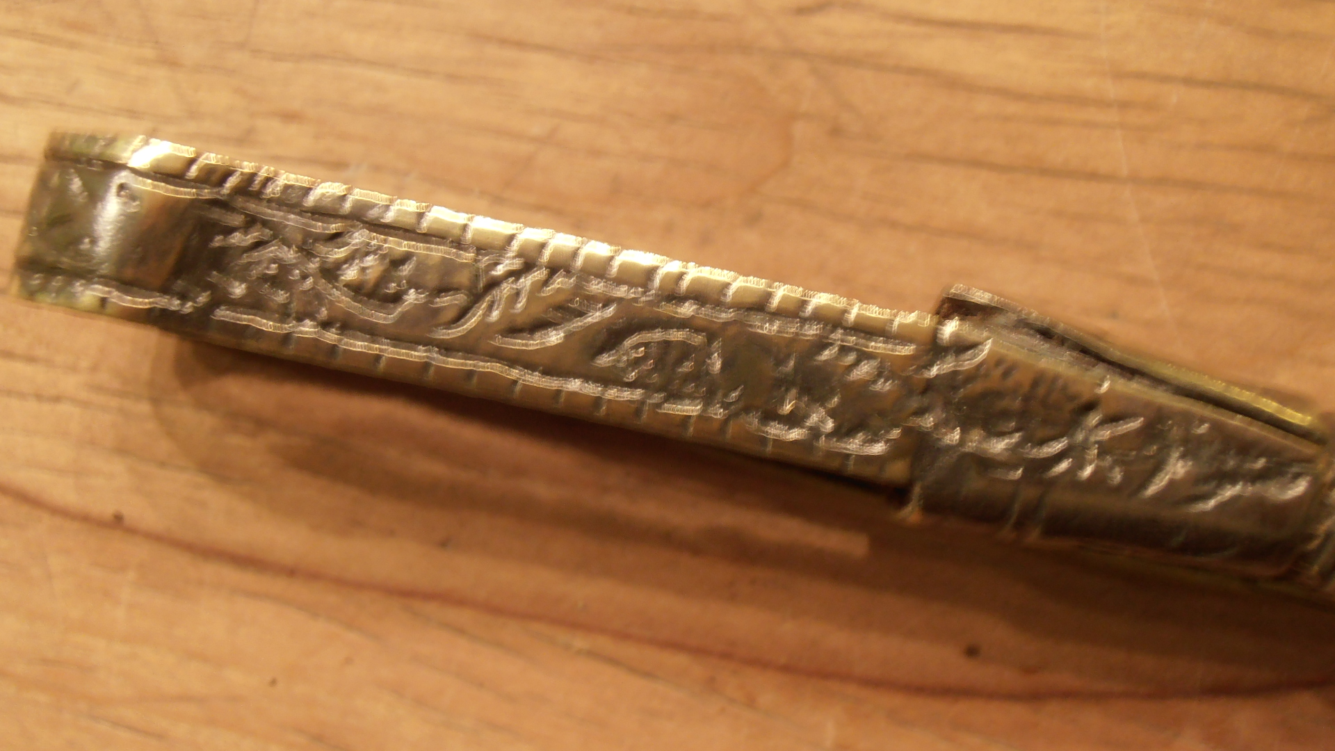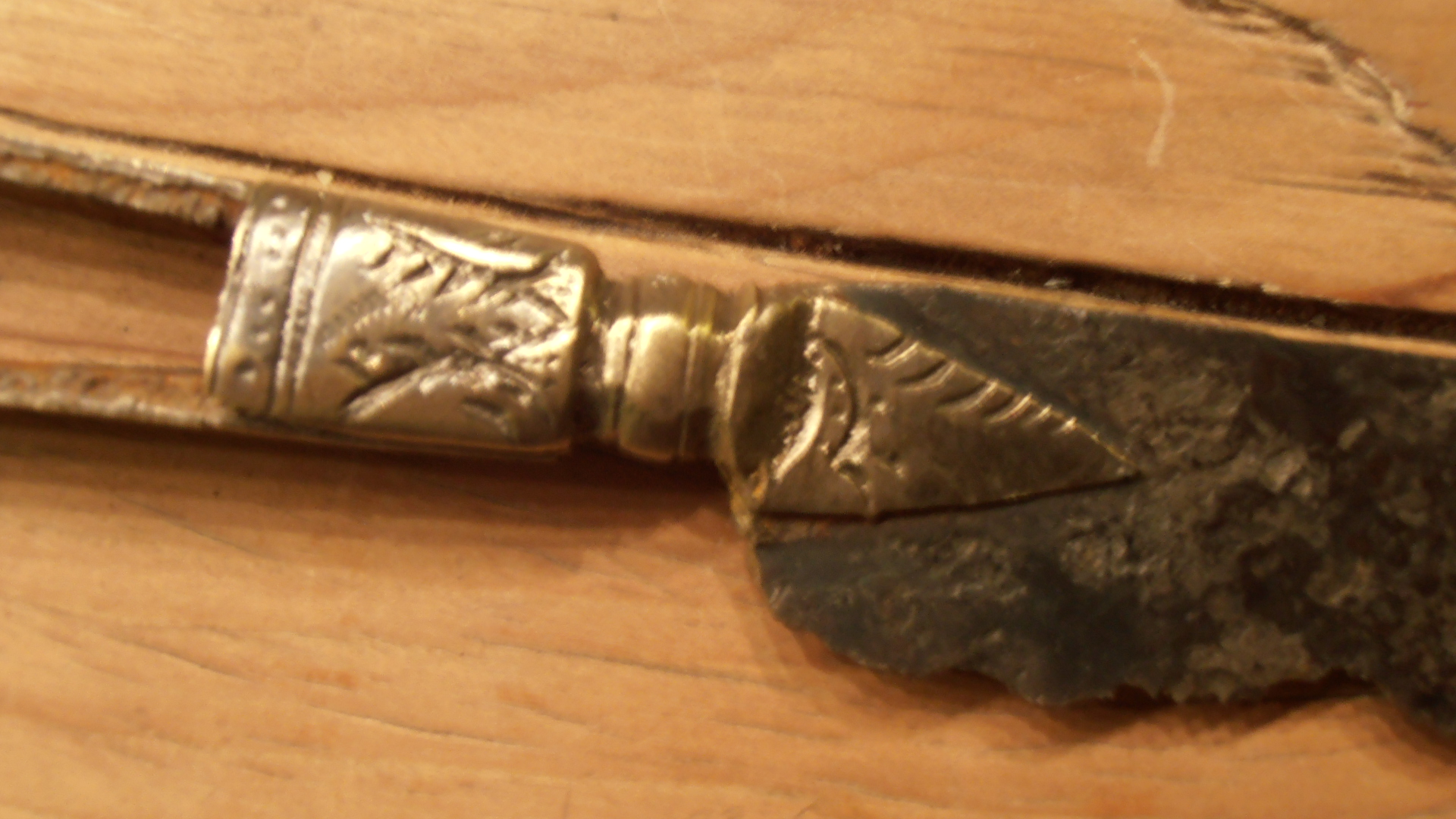 Der Griff ist mit einem ca. 1mm dickem Messingblech überzogen, und eine Länge hat es von ca. 20cm.