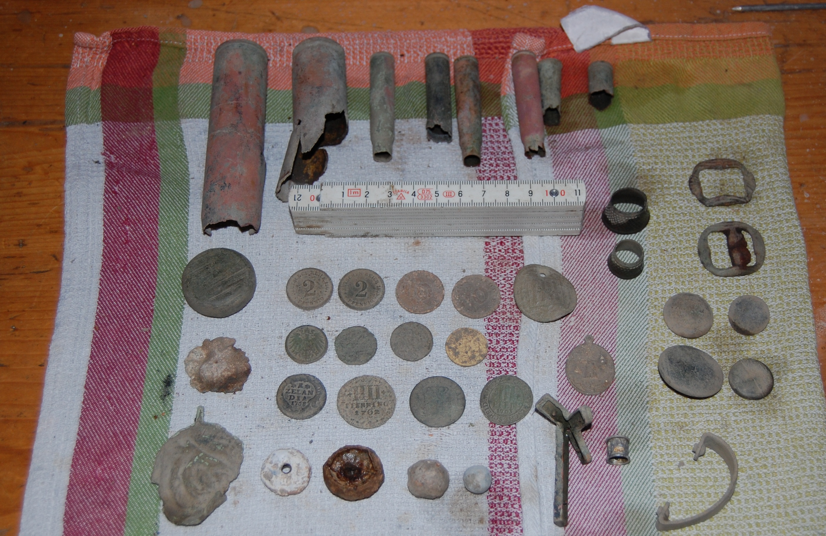 Reichspfennige(wie immer) ein paar neuzeitliche Münzen(alles Kupfer).Ein paar Knöpfe und noch so kleinkram aber alles neuzeitlich.Das gebogene Stück Metall wird wohl in Richtung Möbelbelsschlag gehen.