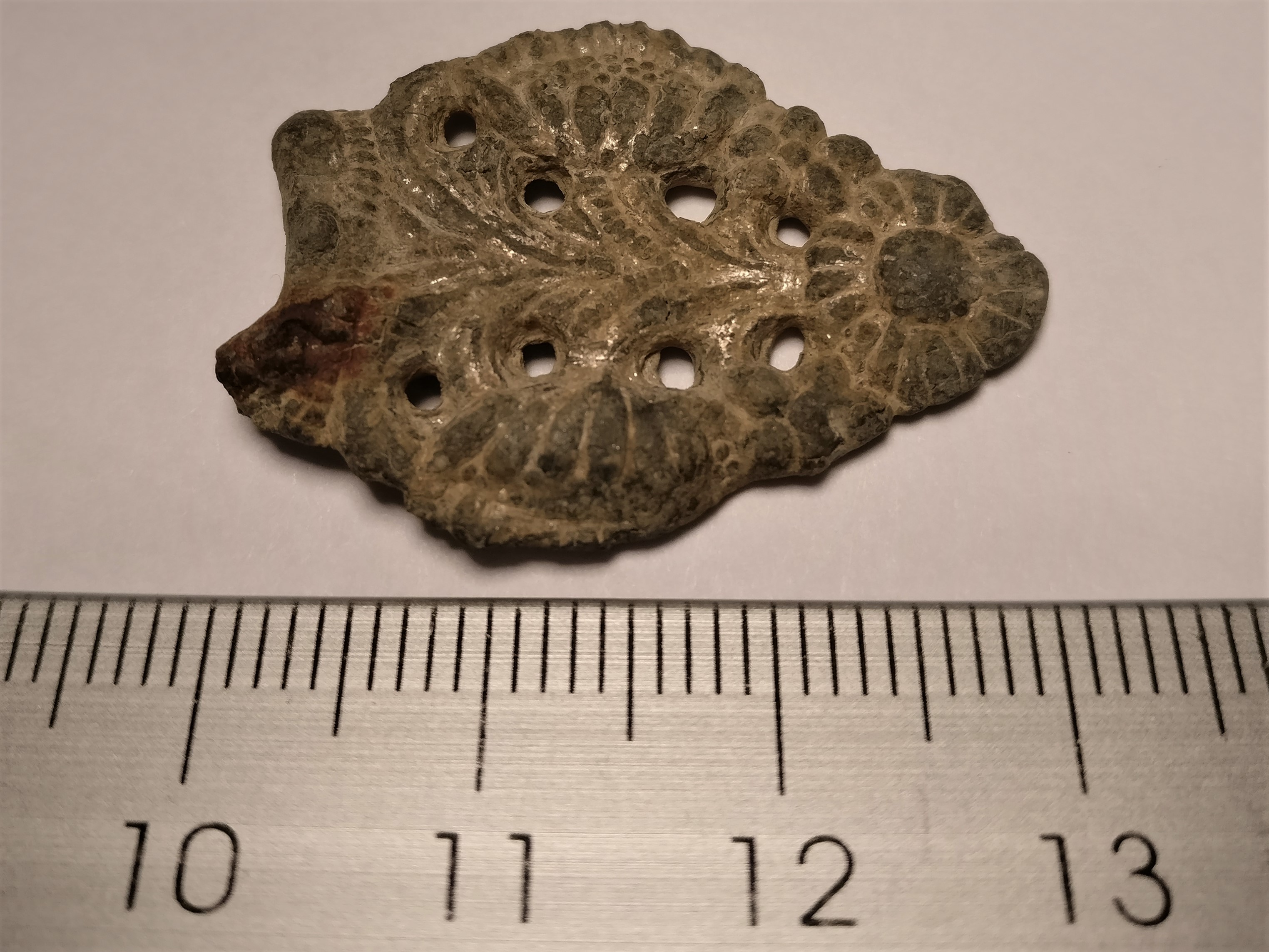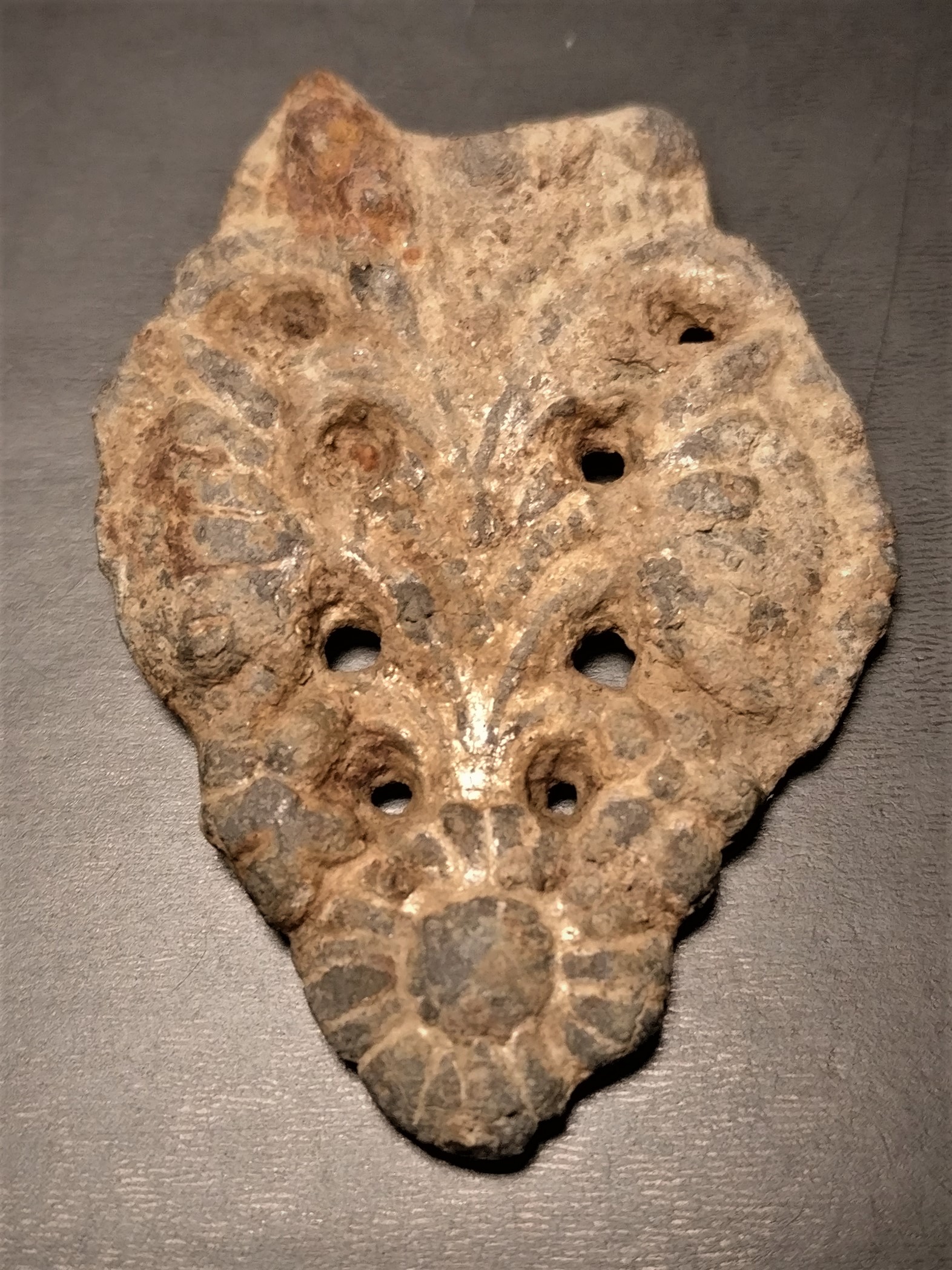 Ich denke, dass der verrostete Rest auf der oberen linken Ecke einmal eine Befestigung war, wonach ich auf eine bäuerliche florale Brosche tippe?