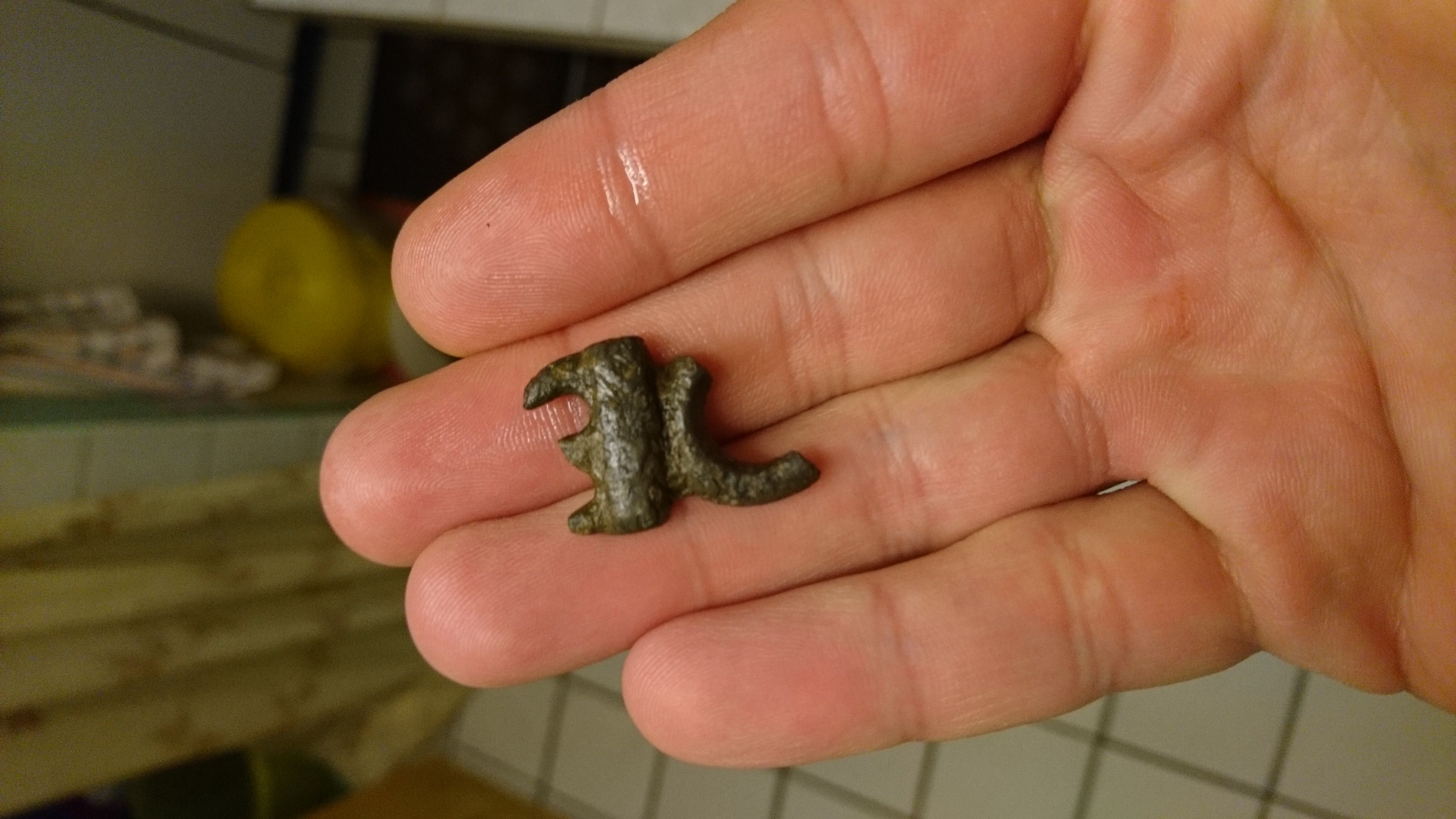 Könnt so einiges sein... Bruchstück eines Riemen bzw. Zaumzeugs vielleicht. Is schwer zu sagen... sieht mir recht alt aus... der untere Teil sieht sogar aus wie ein ringschlüssel.... aber wie hat man ihn dann eingeführt... vielleicht kommt noch jemand ne zündende Idee... ich kenn jemand, der bestimmt sagen kann, was es nicht is... is bei dem ein hobby :D